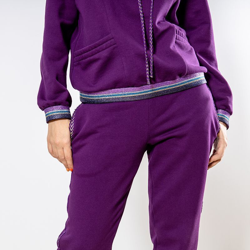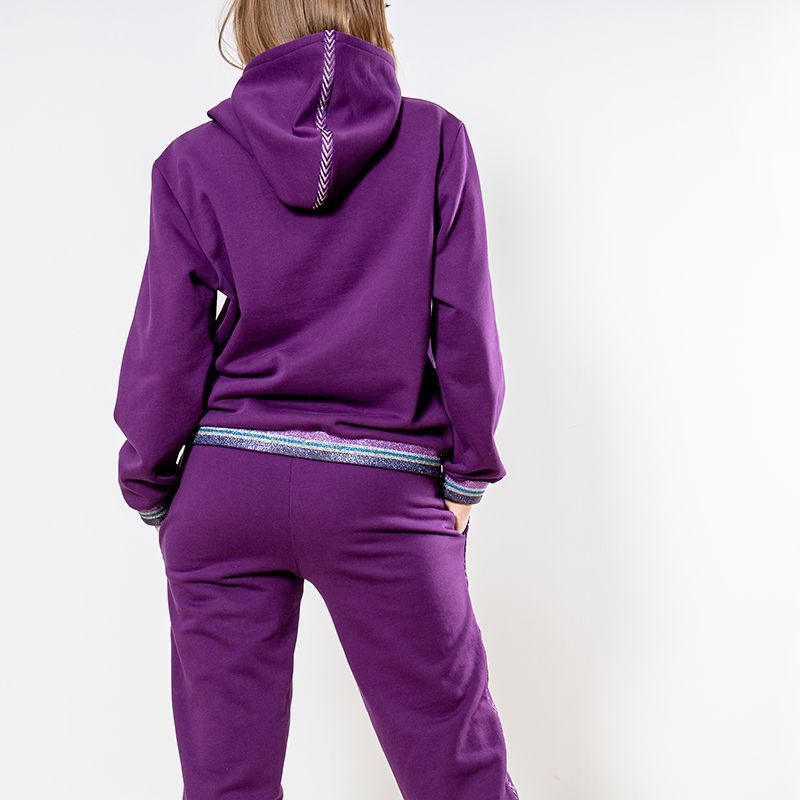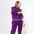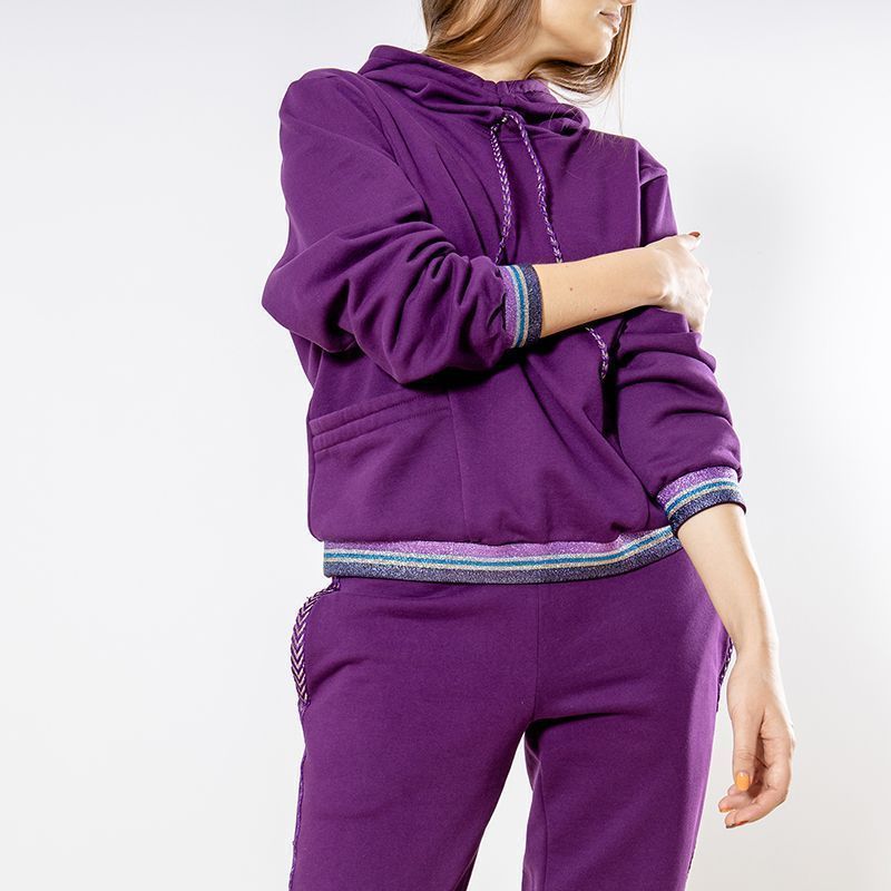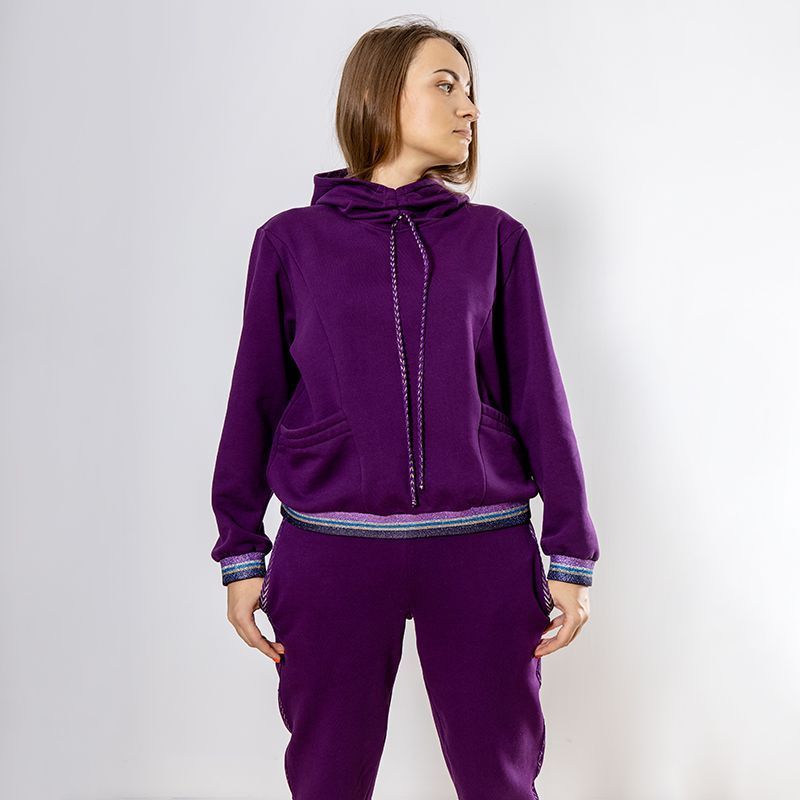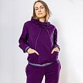 Женский костюм из 3-х ниточного футера с начесом насыщенного пурпурного оттенка. Комплект состоит из худи и штанов. Худи с оригинальным кроем капюшона: целькроенная стойка с кулисой, которая фиксируется на декоративный шнурок. Рукава спущенные, 2 врезных кармана. Манжеты на рукавах и низ худи оформлены широкой резинкой с люрексом. Штаны зауженного кроя, пояс на резинке, карманы расположены в боковых швах. Костюм предназначен для прогулок, активного отдыха и занятий спортом.