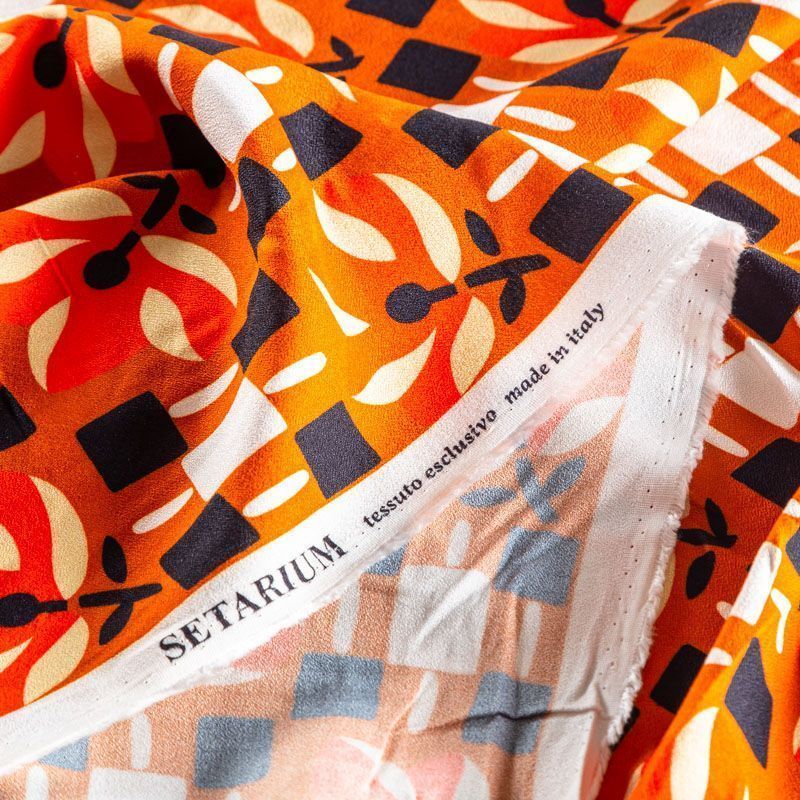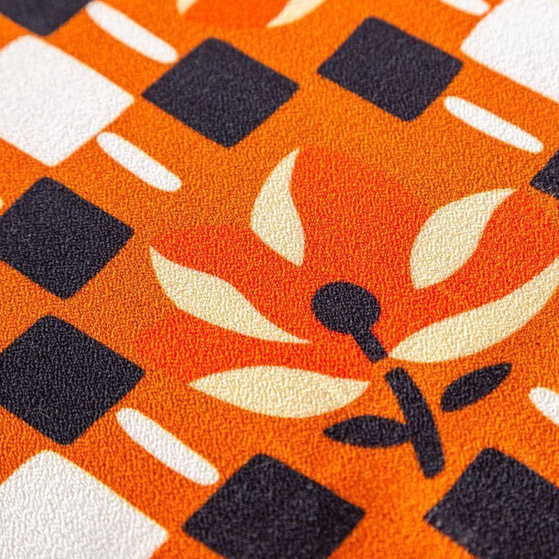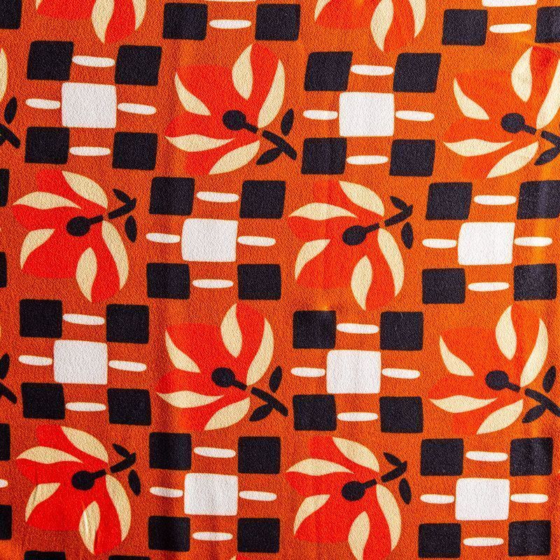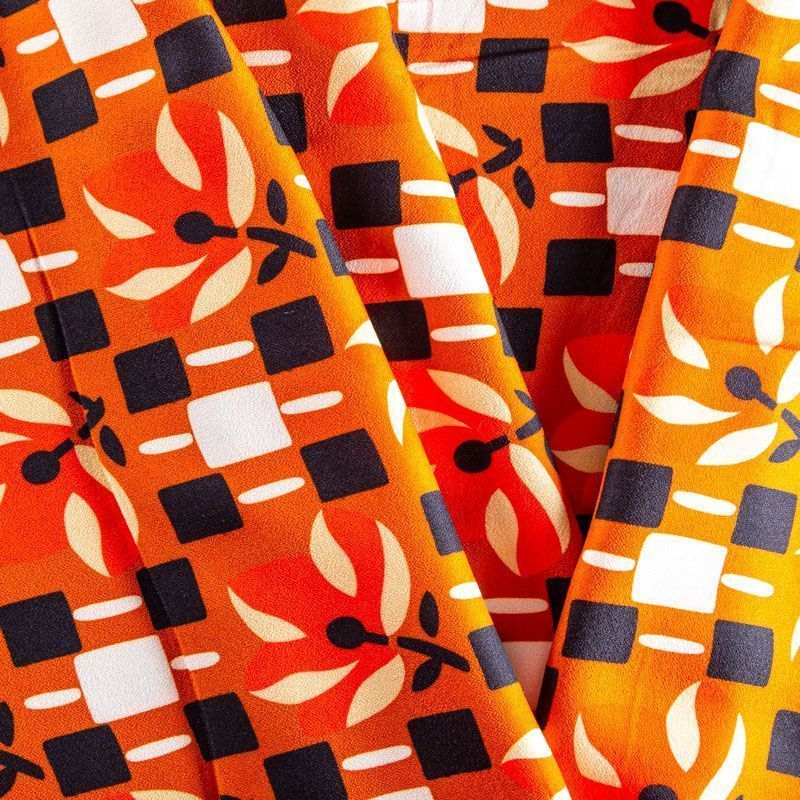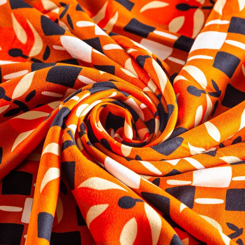 Итальянский вискозный креп плательной плотности насыщенного оранжевого цвета с черно-белым абстрактным принтом. Поверхность матовая и фактурная, ткань малосминаемая, тянется за счет эластана в составе, красиво драпируется, струится и дает объемную складку, не просвечивает. Идеально подойдет для шикарного платья, блузы, юбки, комбинезона, брюк свободного кроя, костюма.