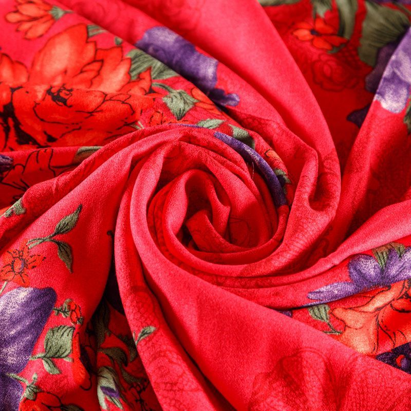 Плательно-блузочная вискозная ткань насыщенного красного оттенка с крупным цветочным принтом с креповым плетением. Ткань средней плотности, имеет зернистую фактуру и матовую поверхность, не просвечивает, пластичная, хорошо драпируется мягкими складками, струится. Подходит для пошива платья и сарафана, юбки, блузки, туники, топа, комбинезона.