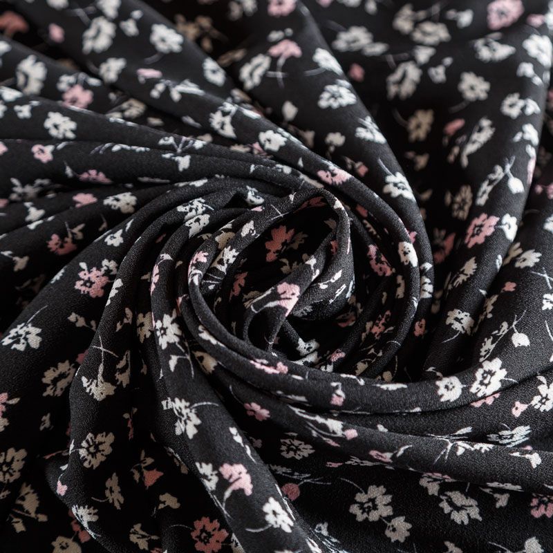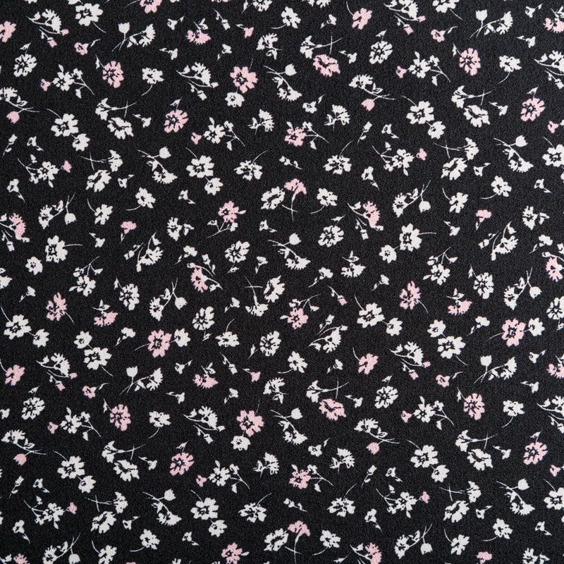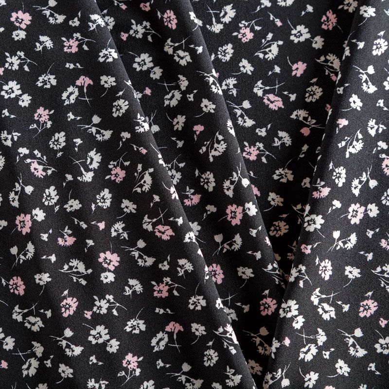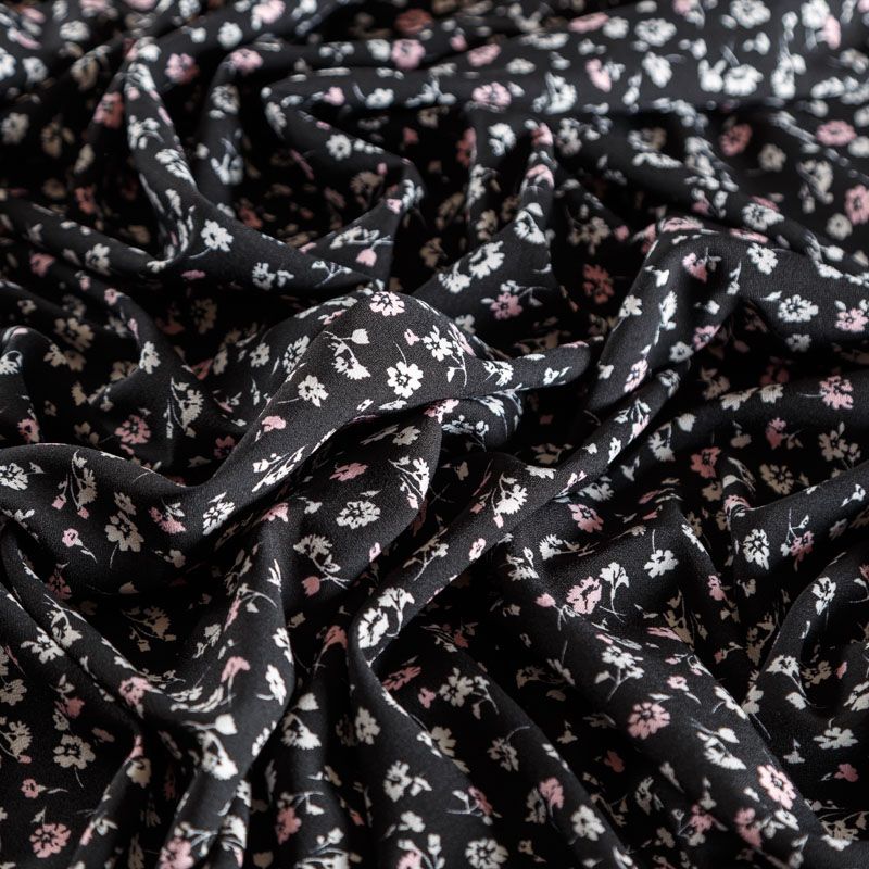 Плательный креп с трендовым уже не первый сезон мелкоцветным принтом на черном фоне, приятный и комфортный в носке, не мнется и не прозрачен на свету, имеет мелкозернистую матовую поверхность, тянется за счет эластана в составе. Идеально подойдет для пошива платья, юбки, широких брюк, комбинезона, блузки, топа или туники.