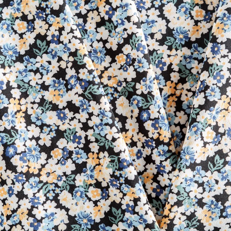 Плательный креп с трендовым уже не первый сезон мелкоцветным принтом на черном фоне, приятный и комфортный в носке, не мнется и не прозрачен на свету, имеет мелкозернистую матовую поверхность, тянется за счет эластана в составе. Идеально подойдет для пошива платья, юбки, широких брюк, комбинезона, блузки, топа или туники.