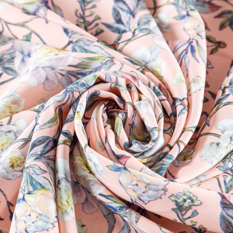 Ткань плательной плотности с флористическим принтом в приглущенных пастельных оттенках. Материал почти мнется и немного прозрачен на свету, имеет креповую фактуру, легкий, хорошо тянется, драпируется струящимися складками, приятный и комфортный в носке. Идеально подходит для пошива платьев, юбок, блуз, комбинезонов.