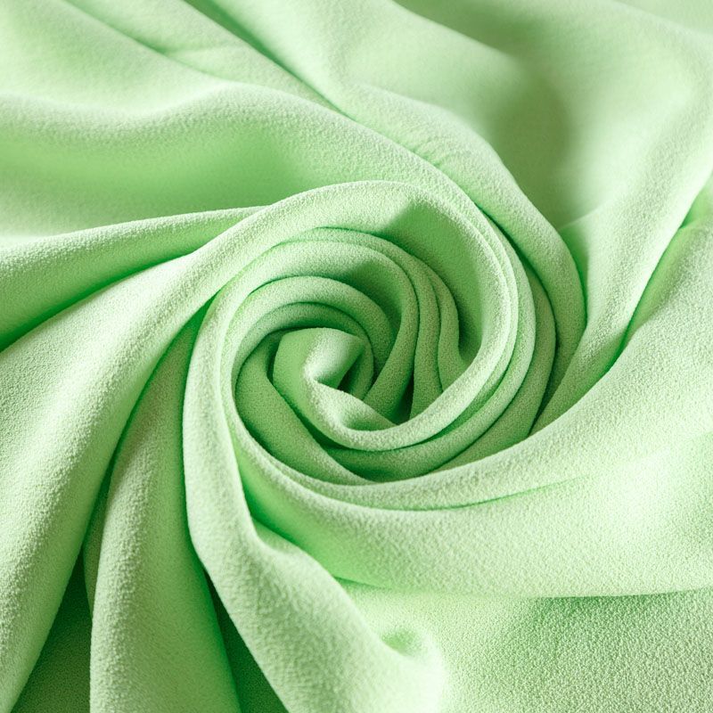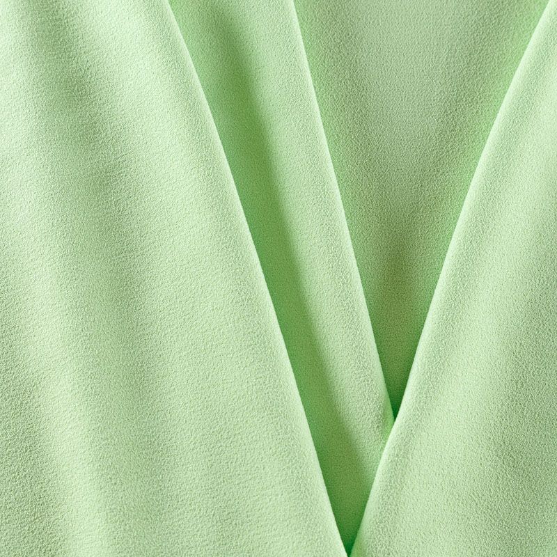Итальянский вискозный креп костюмно-плательной плотности в салатовом оттенке. Ткань имеет зернистую фактуру и матовую поверхность, не просвечивает, пластичная, хорошо драпируется мягкими складками. Подходит для пошива костюма, платья, сарафана, юбки брюк, шорт, комбинезона.
