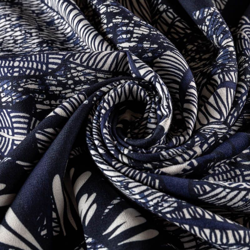 Натуральная вискозная ткань с абстрактным принтом в синих оттенках. Легкая, хорошо тянется, драпируется струящимися складками, приятная и комфортная в носке. Идеально подходит для пошива  платьев, юбок, блуз, комбинезонов. Материал слегка мнется и прозрачен на свету, имеет креповую фактуру.