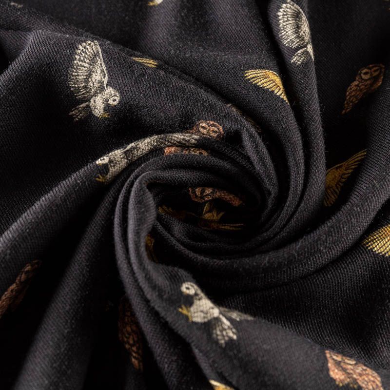 Плотный креп из вискозы с ярким принтом в виде милых совушек на черном фоне. Ткань хорошо держит форму, почти не мнется, имеет заметную фактуру пике и очень прочная - подходит для пошива эффектных бомберов, юбок, платьев в спортивном стиле или легких пальто и жакетов.