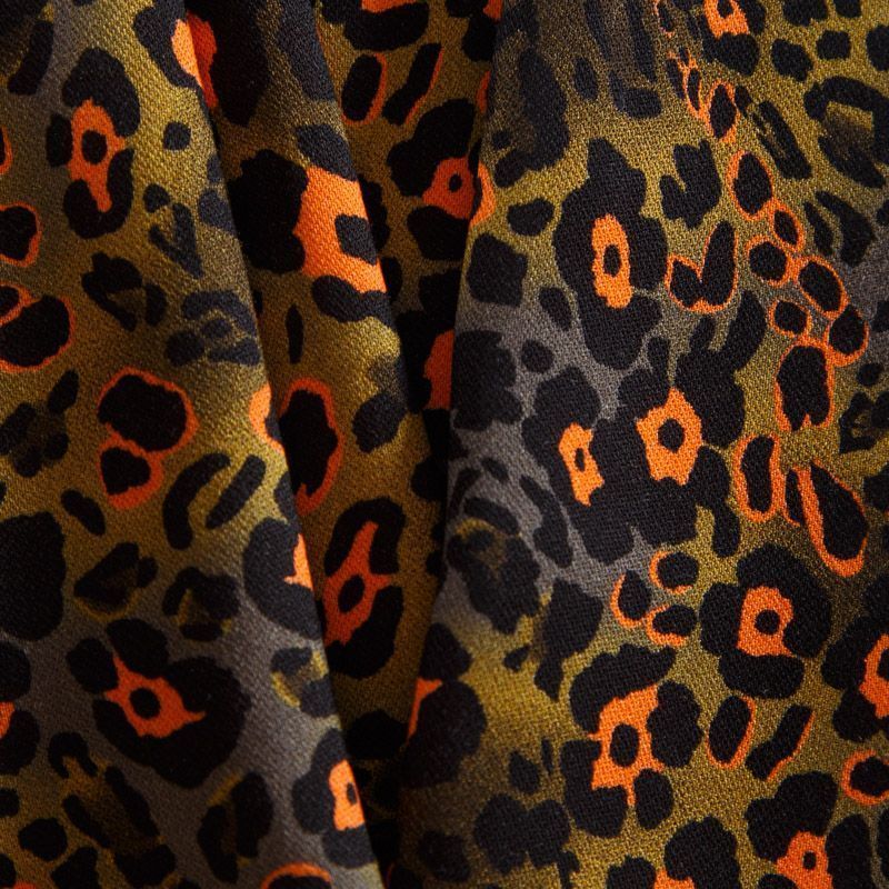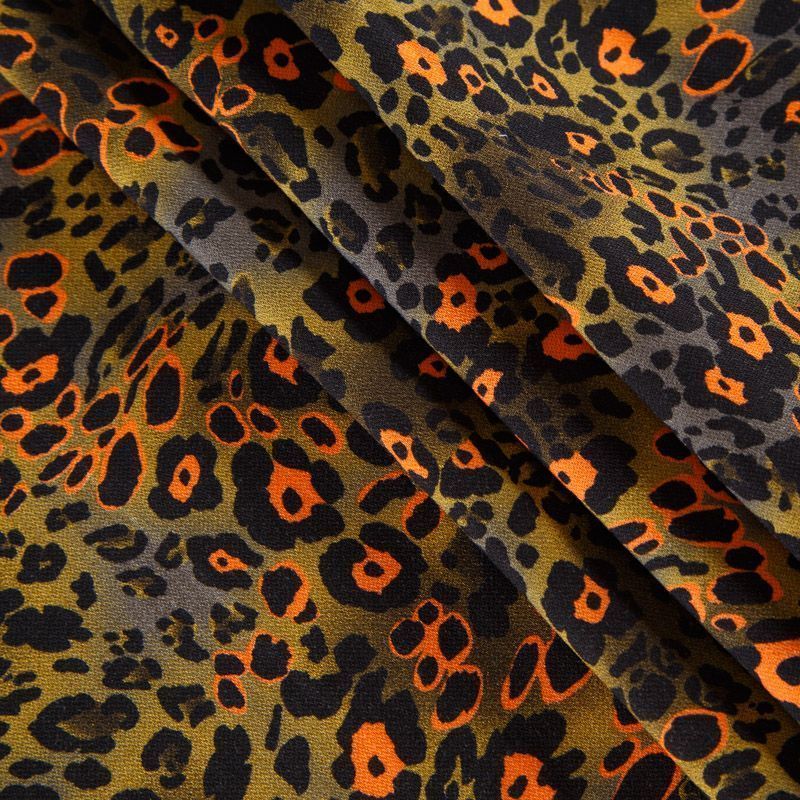 Итальянская натуральная вискозная ткань оливкового оттенка с анималистическим принтом. Ткань легкая, хорошо тянется, драпируется струящимися складками, приятная и комфортная в носке. Материал слегка мнется, имеет креповую фактуру. Идеально подходит для пошива платьев, юбок, блуз, комбинезонов, костюмов, туник, кардиганов.