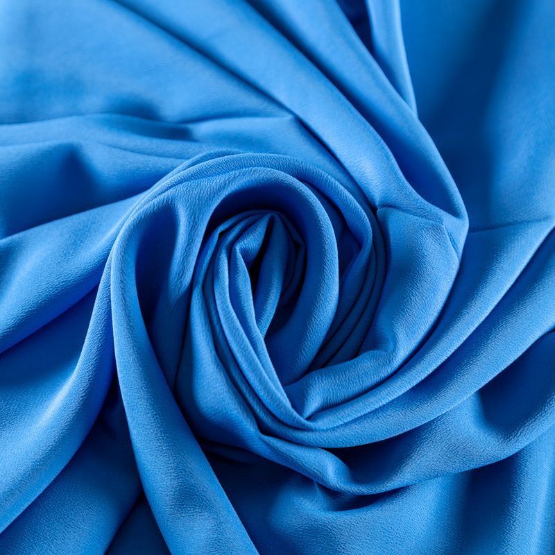 Итальянский натуральный шелковый крепдешин в голубом оттенке, фактурный, легкий и струящийся, слегка просвечивает, отлично драпируется, тянется за счет эластана в составе. Идеально подойдет для пошива платьев и сарафанов расклешенных моделей, с воланами, летящих юбок, топов, блузки, юбки, широких брюк, костюма в пижамном стиле.