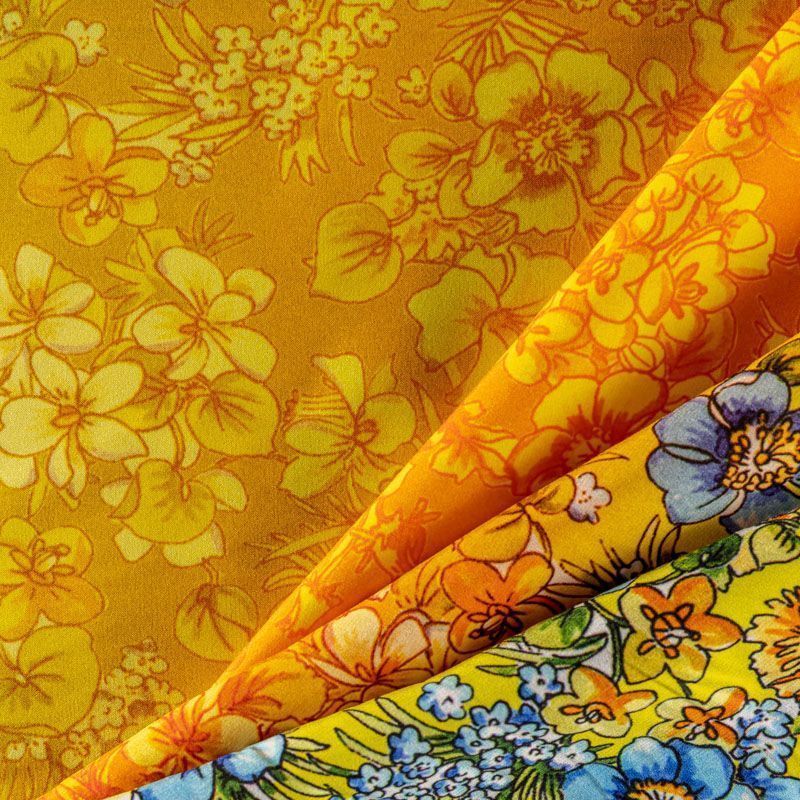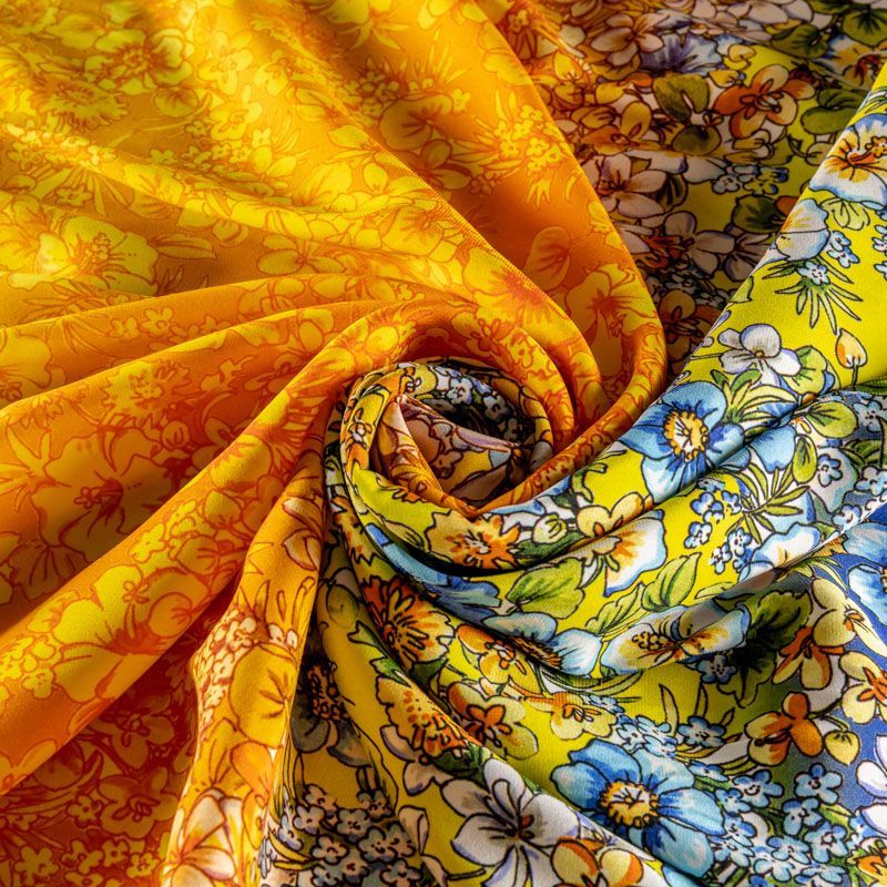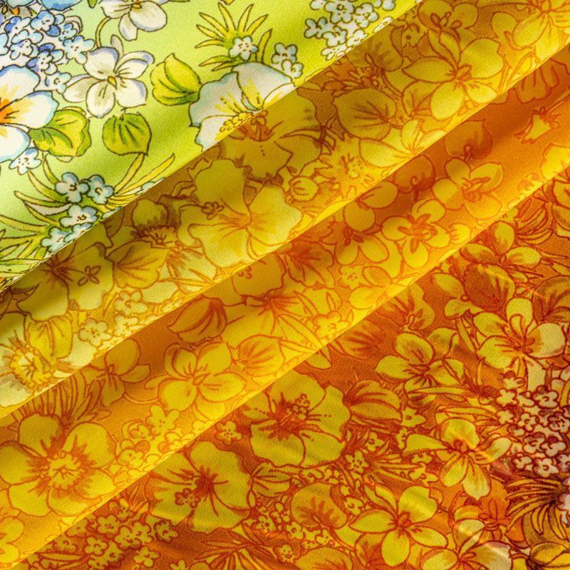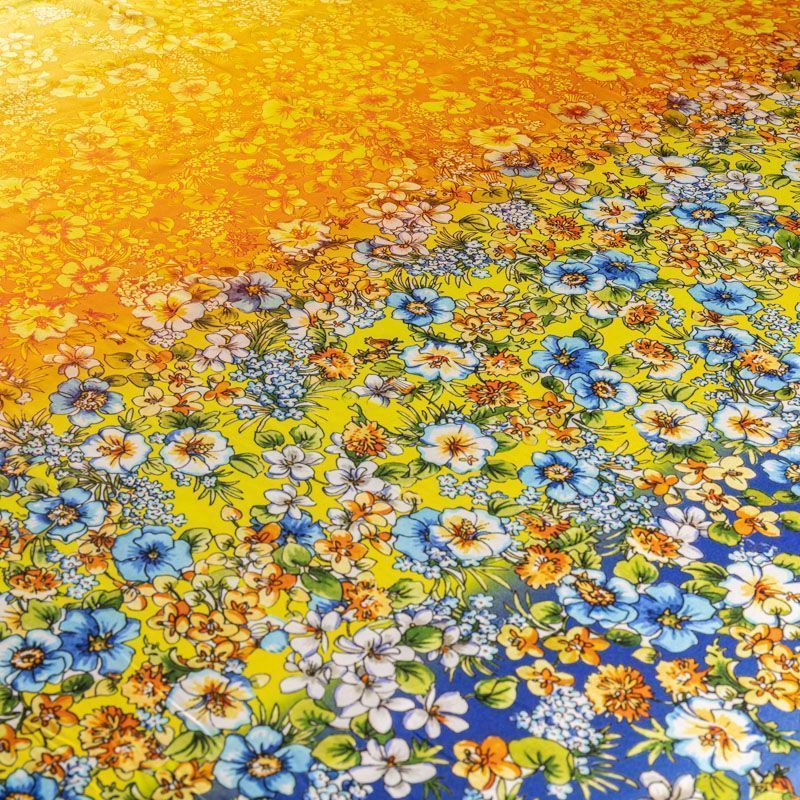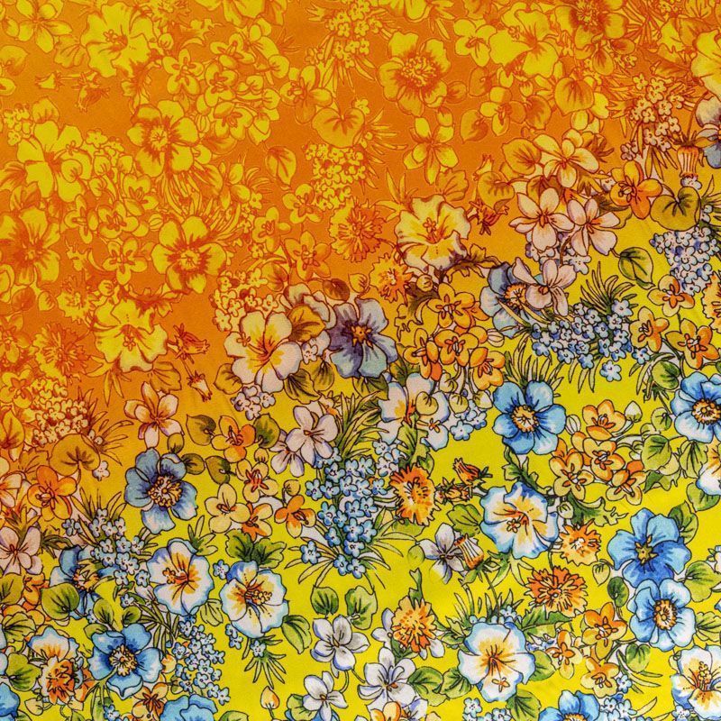 Натуральный шелковый крепдешин с эффектом деграде с плавным переходом от сине-голубого до желтого цвета, дополненный цветочным принтом, подойдет для ценителей ярких образов. Ткань имеет матовую поверхность, легкая, тонкая, струящаяся, хорошо драпируется, тянется за счет эластана в составе. Будет идеальна для пошива летнего сарафана, платья, блузки, костюма в пижамном стиле, широких брюк или юбки.