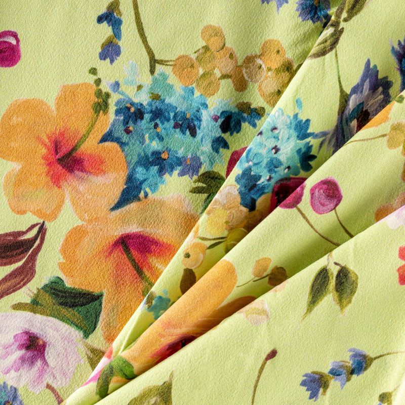 Натуральный шелковый крепдешин с добавлением хлопка с матовой поверхностью, легкий, струящийся, хорошо драпируется. Ткань немного просвечивает, хорошо тянется за счет эластана в составе. Яркий ягодно-цветочный принт на салатовом фоне прекрасно подойдет для пошива летнего сарафана, платья, блузки, костюма в пижамном стиле, широких брюк или юбки.