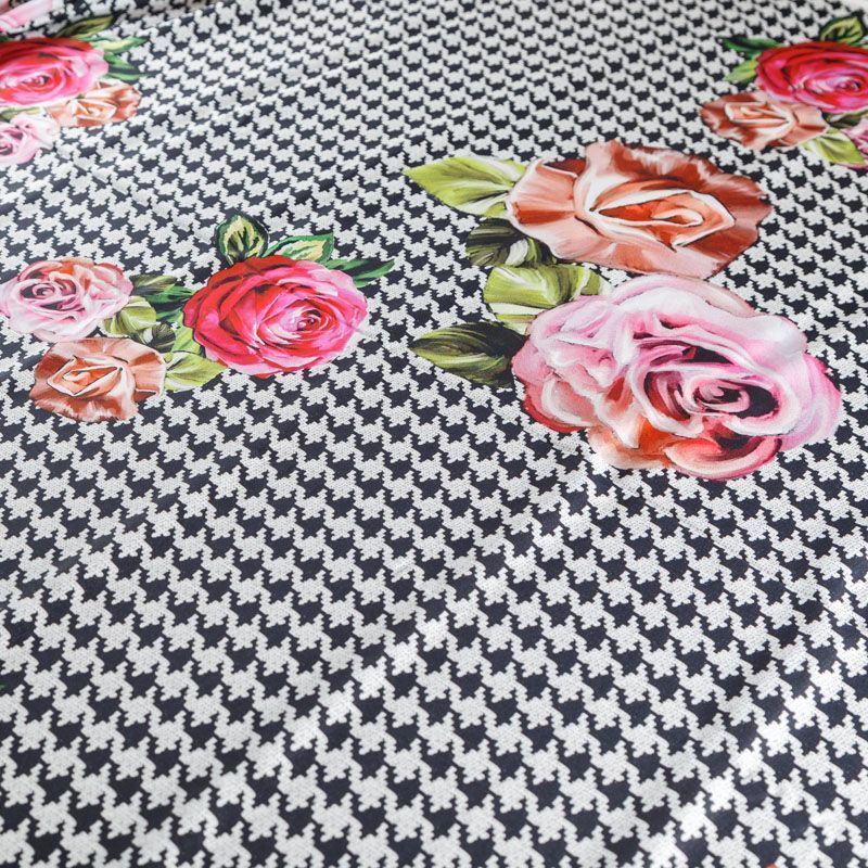 Итальянский крепдешин с матовой лицевой поверхностью с принтом гусиная лапка и цветами, тонкий, слегка прозрачный, отлично драпируется, тянется за счет эластана в составе, легкий и струящийся. Идеально подойдет для пошива платьев и сарафанов расклешенных моделей, с воланами, летящих юбок, топов, блузки, костюма в пижамном стиле.