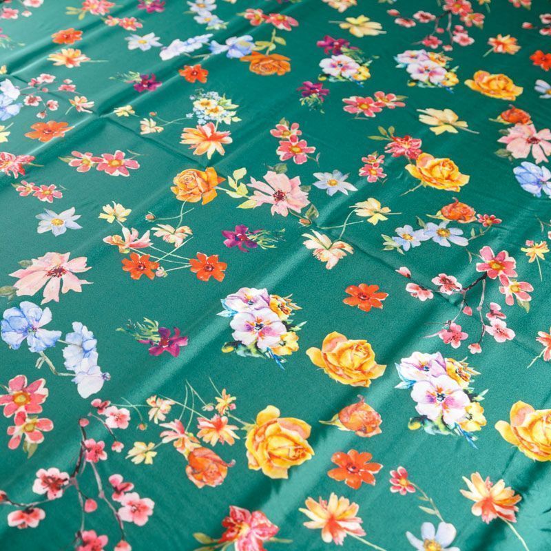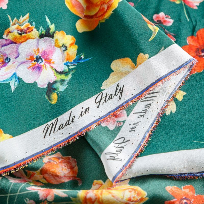 Итальянский крепдешин с матовой лицевой поверхностью с цветочным принтом на зеленом фоне, тонкий, слегка прозрачный, отлично драпируется, легкий и струящийся. Идеально подойдет для пошива платьев и сарафанов расклешенных моделей, с воланами, летящих юбок, топов, блузки, костюма в пижамном стиле.
