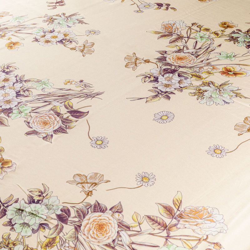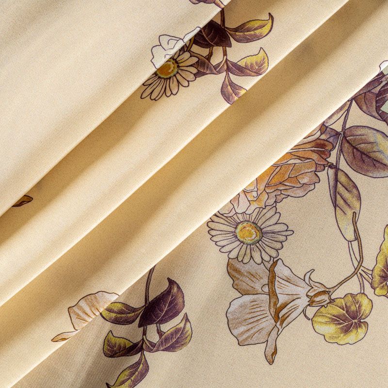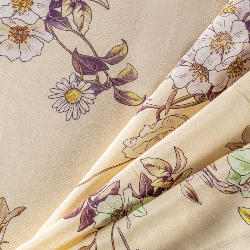 Натуральный шелковый крепдешин с матовой поверхностью, легкий, струящийся, хорошо драпируется. Элегантный цветочный принт выполнен в натуральных оттенках и будет уместен для пошива летнего сарафана, платья, блузки, костюма в пижамном стиле, широких брюк или юбки.