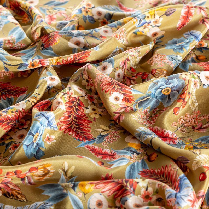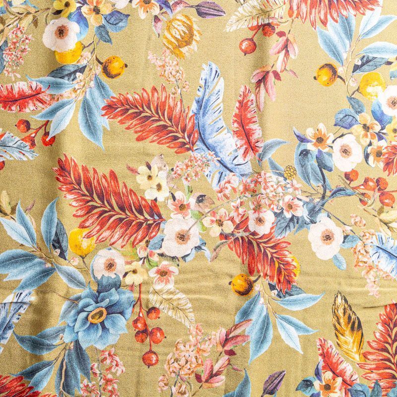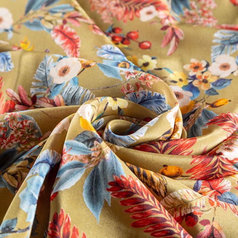 Шикарный итальянский непрозрачный крепдешин с матовой поверхностью. Красивый фантазийный цветочный принт на золотисто-оливковом фоне сделает образ необычным и женственным. Ткань очень приятная к телу, олично драпируется, пластичная и практически не мнётся. Прекрасно подходит для пошива блузки, топа, струящегося платья, красивого комбинезона, костюма в пижамном стиле.