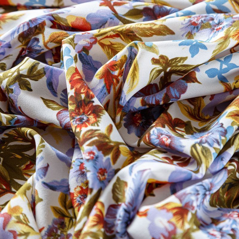 Крепдешин с цветочным летним принтом, тонкий, легкий, фактурный, приятный на ощупь. Очень пластичный, тянется за счет эластана в составе, прекрасно драпируется и струится. Ткань слегка просвечивает, можно использовать подклад. Идеально будет смотреться в платье, юбке, тунике, рубашке или блузке.