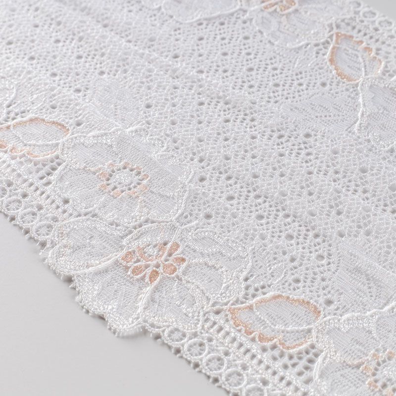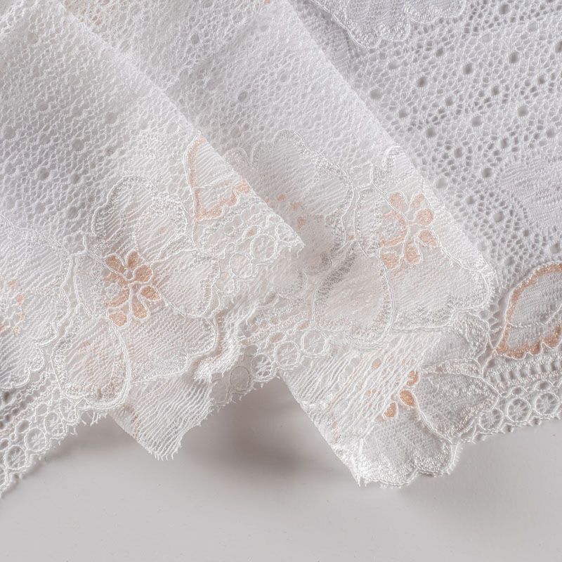Эластичное кружево сочетает в себе мягкость, прочность и красоту, благодаря своей упругости оно долго не теряет первоначальную форму. Используется для пошива нижнего белья, а так же применяется как отделочный декор в одежде.