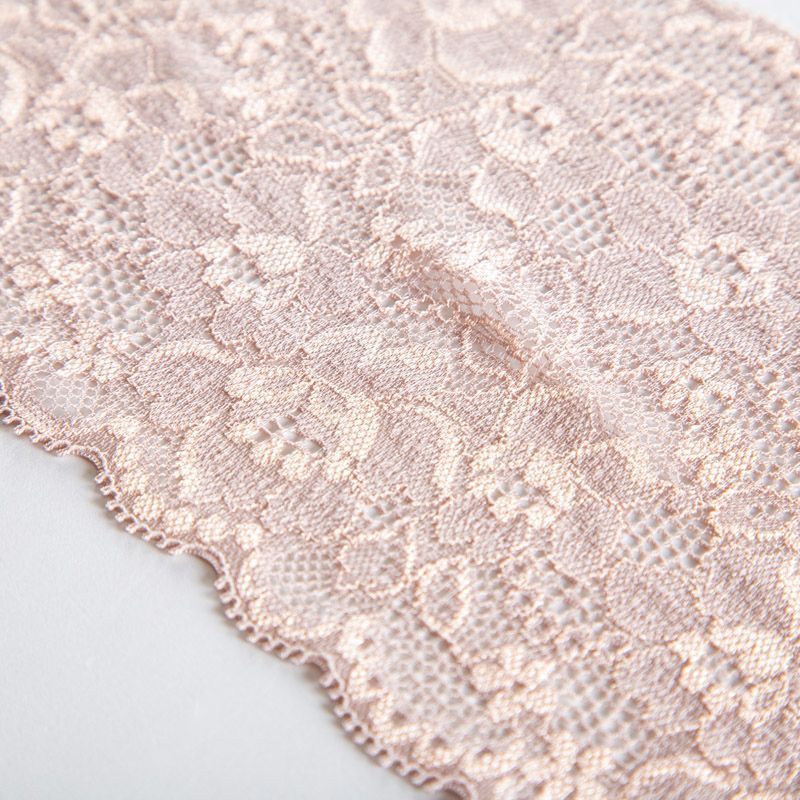 Эластичное кружево сочетает в себе мягкость, прочность и красоту, благодаря своей упругости оно долго не теряет первоначальную форму. Используется для пошива нижнего белья, а так же применяется как отделочный декор в одежде.
