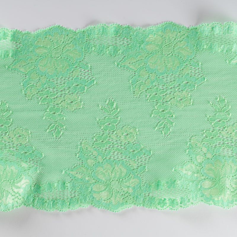 Эластичное кружево сочетает в себе мягкость, прочность и красоту, благодаря своей упругости оно долго не теряет первоначальную форму. Используется для пошива нижнего белья, а так же применяется как отделочный декор в одежде.