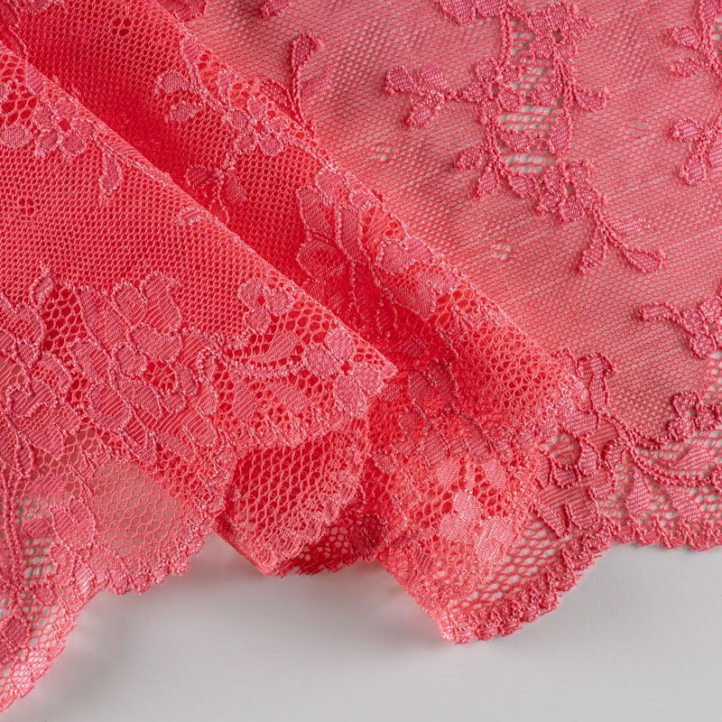 Эластичное кружево сочетает в себе мягкость, прочность и красоту, благодаря своей упругости оно долго не теряет первоначальную форму. Используется для пошива нижнего белья, а так же применяется как отделочный декор в одежде.