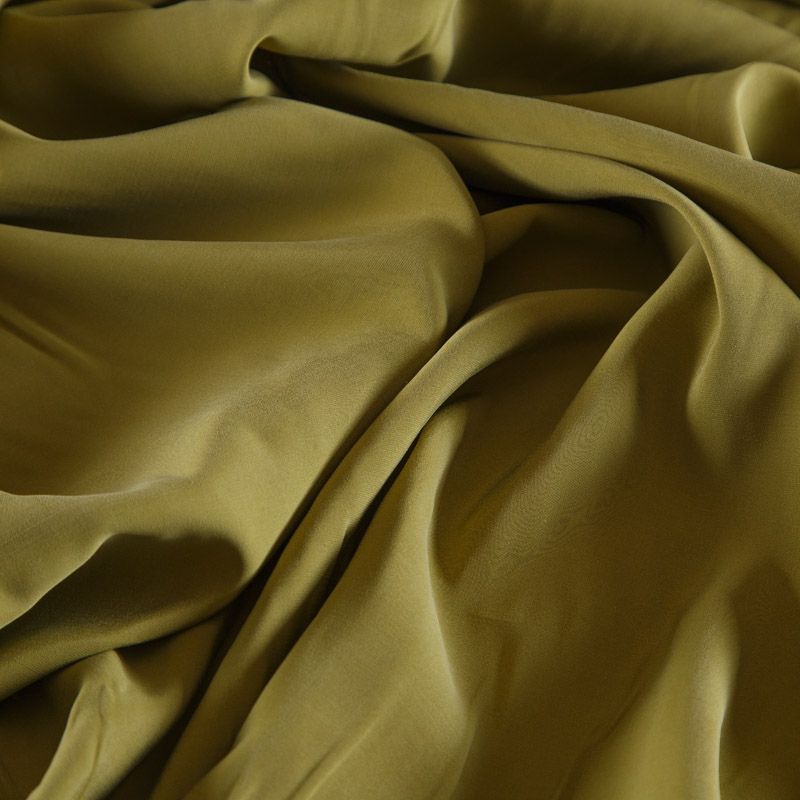 Итальянская купро плательно-костюмной плотности зеленого оттенка. Ткань мягкая, пластичная, струящаяся, отлично драпируется, не просвечивает. Поверхность ткани бархатистая, похожа на мокрый шелк. Идеально подойдет для платьев свободного силуэта, брюк-палацио, юбок, шорт, туник, платья-рубашки, блузы.