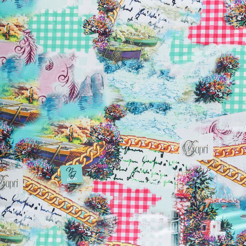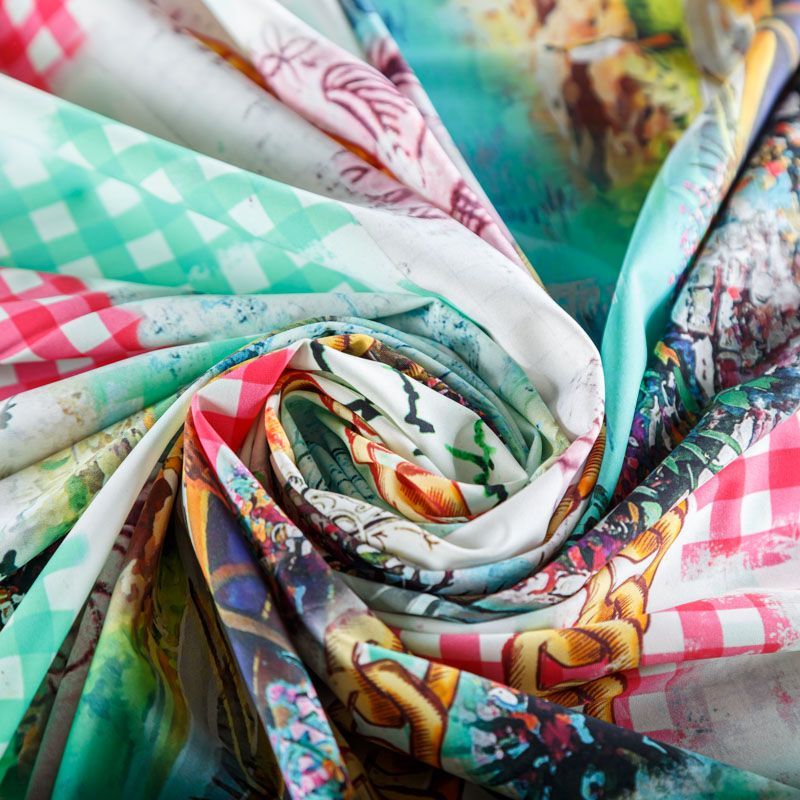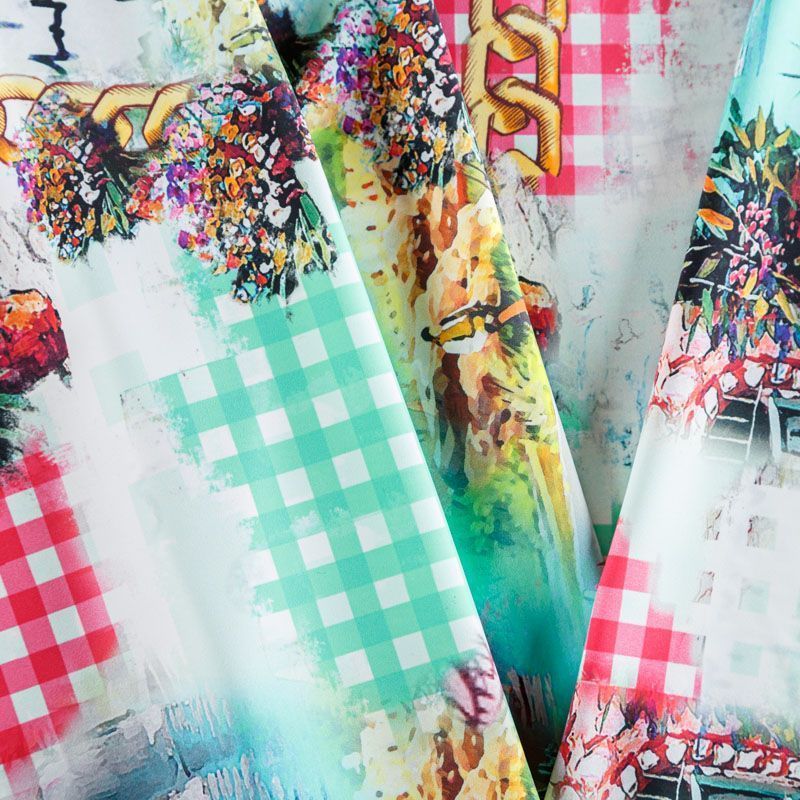 Итальяская качественная, красивая и приятная на ощупь лайкра белого цвета с акварельным ярким принтом. Поверхность ткани матовая, при этом шелковистая и гладкая. Идеально облегает фигуру, тянется по двум направлениям, хорошо драпируется, устойчива к пилингу, долговечна и гигроскопична. Используется для пошива одежды для танцев, гимнастики, фигурного катания, для велоспорта, легкой атлетики и аэробики, фитнеса и других видов спорта, для купальников, женского белья, театральных, цирковых и эстрадных костюмов.