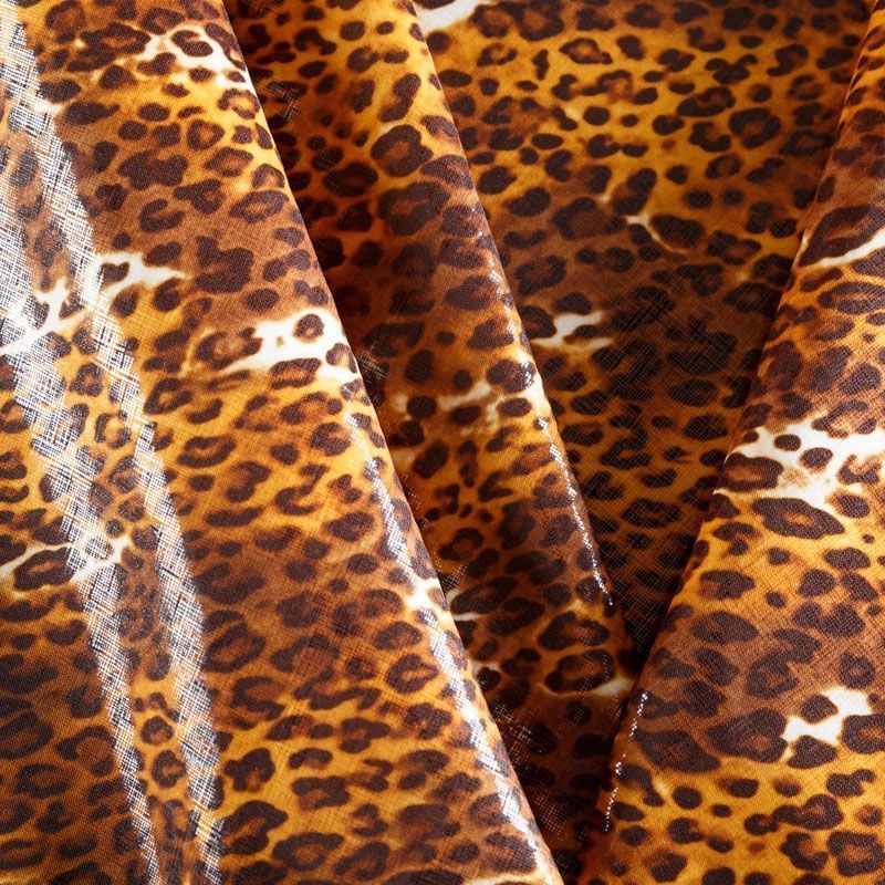 Итальяская качественная, красивая и приятная на ощупь лайкра с анималистическим принтом в желто-коричневых оттенках. Поверхность имеет искрящийся глянец за счет лазерной обработки ткани. Идеально облегает фигуру, тянется по двум направлениям, хорошо драпируется, отлично держит форму, устойчива к пилингу, долговечна и гигроскопична. Используется для пошива одежды для танцев, гимнастики, фигурного катания, для велоспорта, легкой атлетики и аэробики, фитнеса и других видов спорта, для купальников, женского белья, театральных, цирковых и эстрадных костюмов.