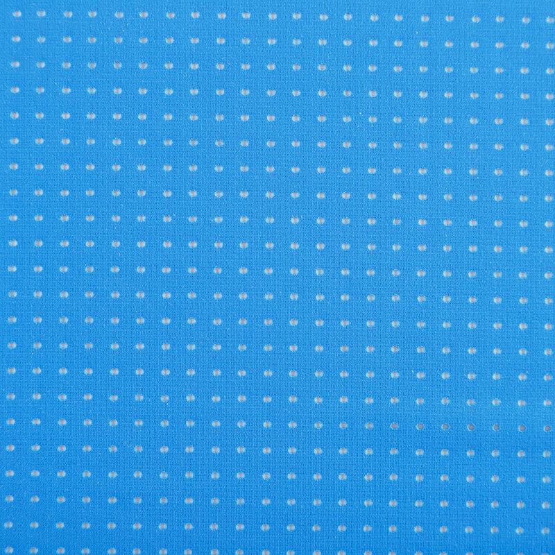 Итальяская качественная, красивая и приятная на ощупь лайкра с перфорацией синего оттенка. Поверхность ткани матовая, гладкая, шелковистая на ощупь. Идеально облегает фигуру, тянется по двум направлениям, хорошо драпируется, отлично держит форму, устойчива к пилингу, долговечна и гигроскопична. Используется для пошива одежды для танцев, гимнастики, фигурного катания, для велоспорта, легкой атлетики и аэробики, фитнеса и других видов спорта, для купальников, женского белья, театральных, цирковых и эстрадных костюмов.