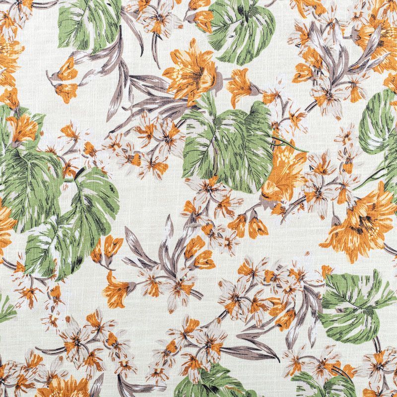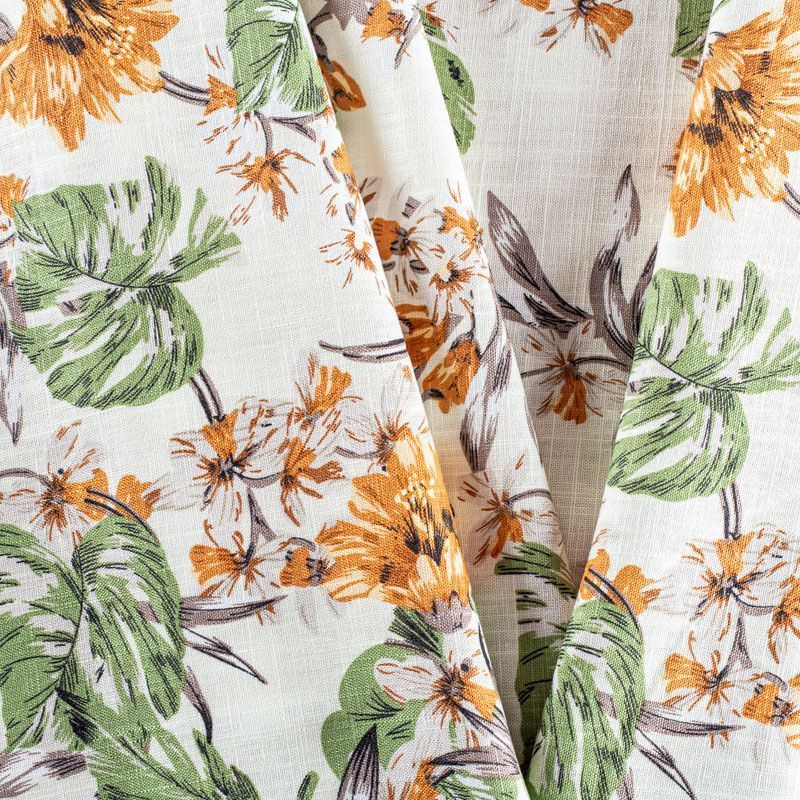 Льняная плательная ткань с добавлением вискозы молочного цвета с растительным принтом. Материал прочный, с выразительной матовой рельефной поверхностью, полотняным плетением, хорошо держит форму, мягкий на ощупь, пластичный, отлично драпируется. Прекрасно подойдет для пошива летних платьев, сарафанов, юбок, рубашек, брюк и шорт.