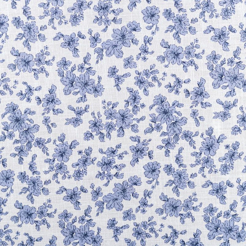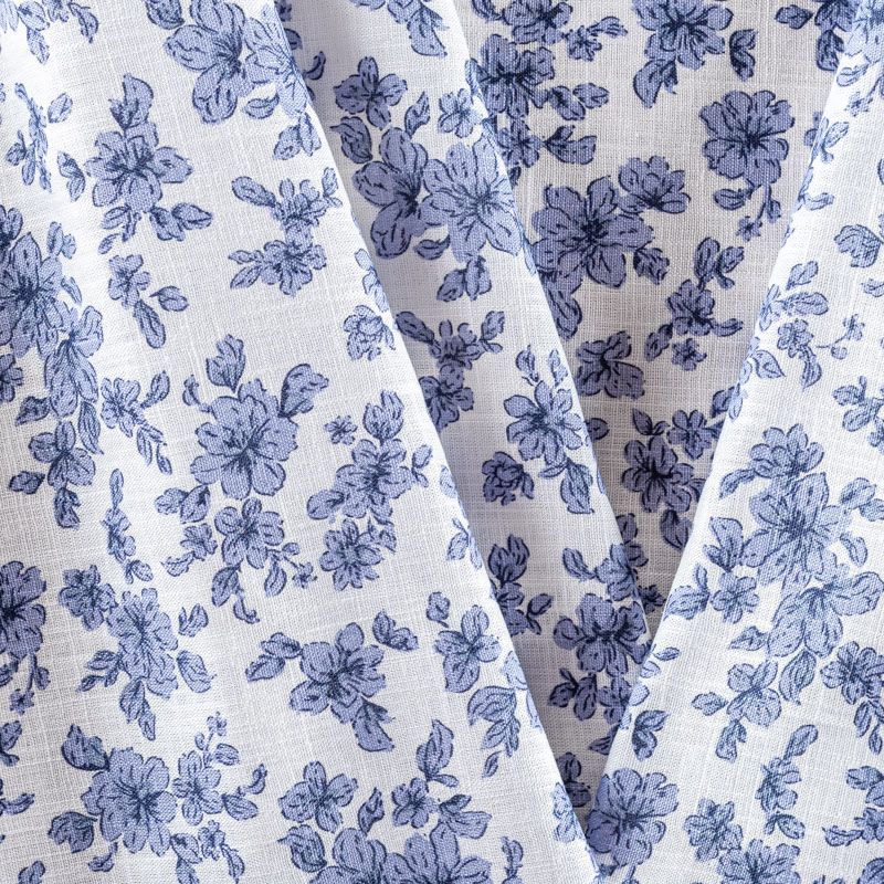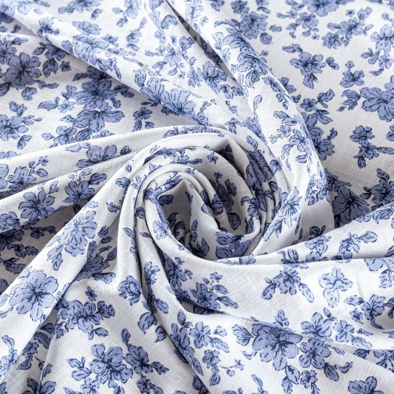 Льняная плательная ткань с добавлением вискозы белого цвета с мелким цветочным принтом. Материал прочный, с выразительной матовой рельефной поверхностью, полотняным плетением, хорошо держит форму, мягкий на ощупь, пластичный, отлично драпируется. Прекрасно подойдет для пошива летних платьев, сарафанов, юбок, рубашек, брюк и шорт.