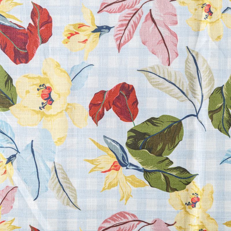 Льняная плательно-рубашечная ткань с ярким цветочным принтом на фоне бело-голубой клетки. Материал прочный, с выразительной матовой рельефной поверхностью, полотняным плетением, хорошо держит форму, тянется за счет эластана в составе, мягкий на ощупь, пластичный, отлично драпируется. Прекрасно подойдет для пошива летних платьев, сарафанов, юбок, рубашек, брюк и шорт.