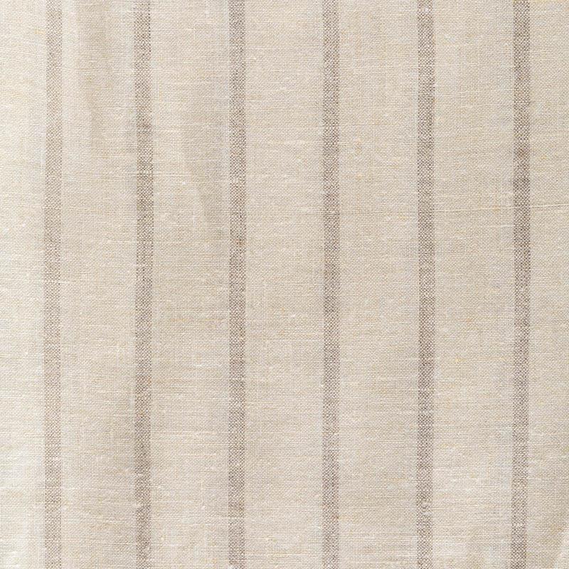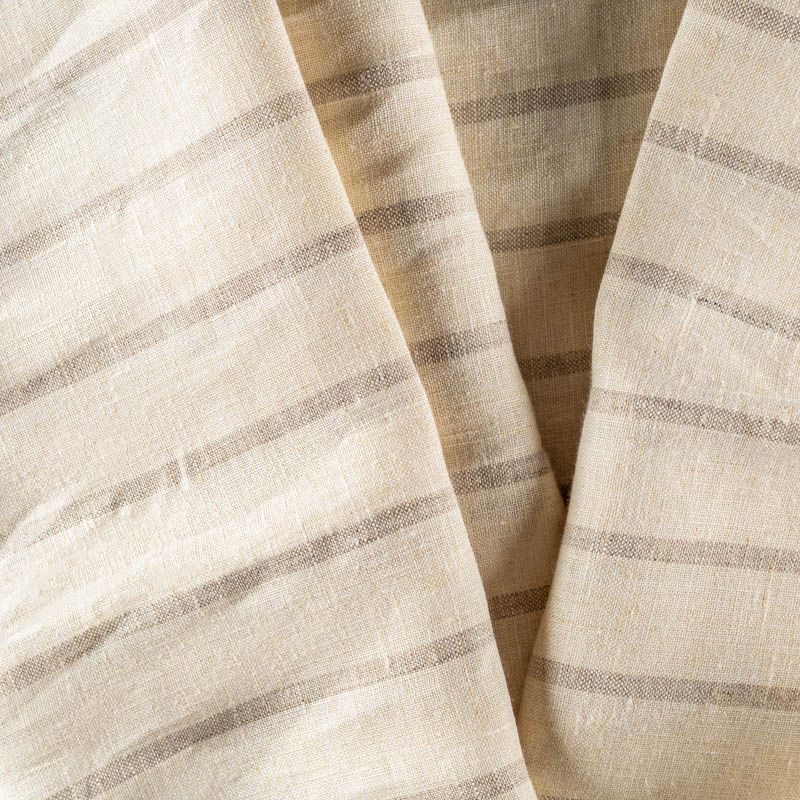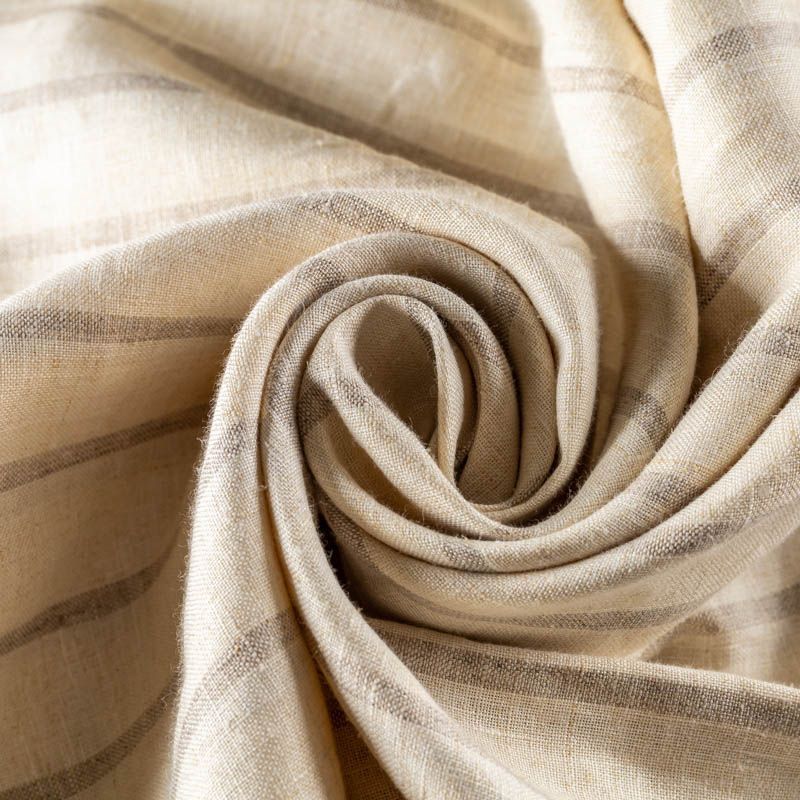 Прочный, выразительная матовая рельефная поверхность, полотняное переплетение, хорошо держит форму, мягкий на ощупь, пластичный, отлично драпируется. Прекрасно подойдет для пошива летних платьев, сарафанов, юбок, рубашек, брюк и шорт. Льняная плательная ткань с узкой серой полоской. Ширина полоски - 1 см.
