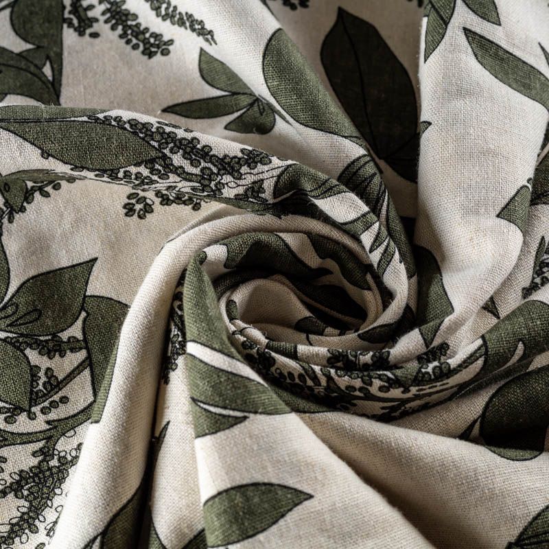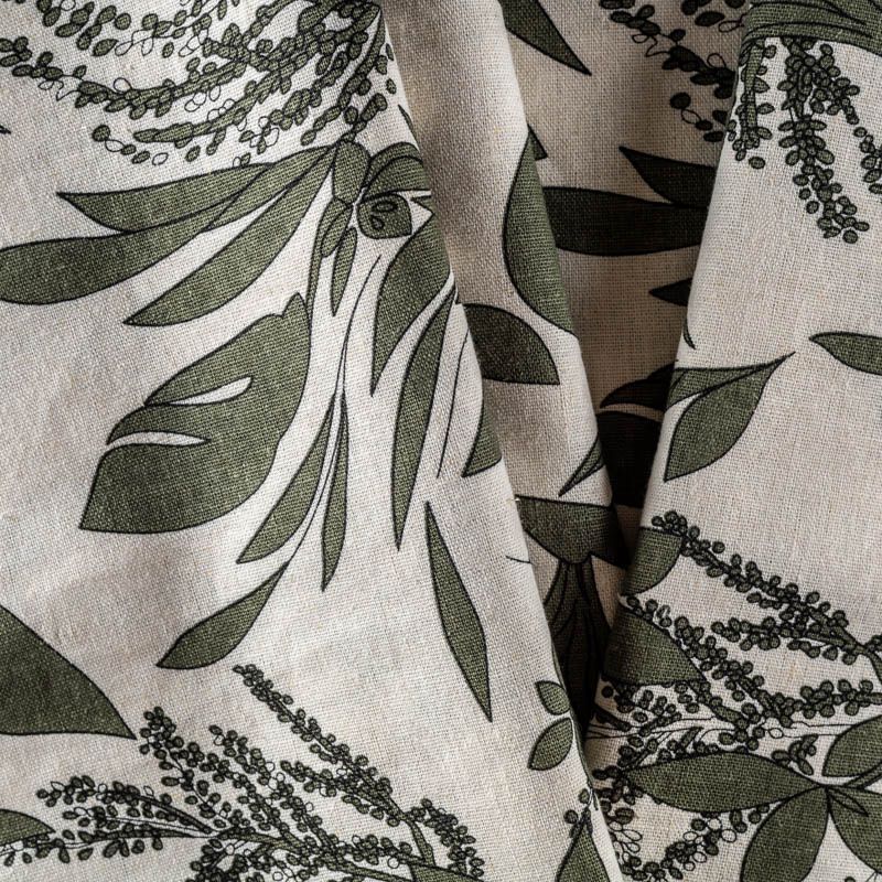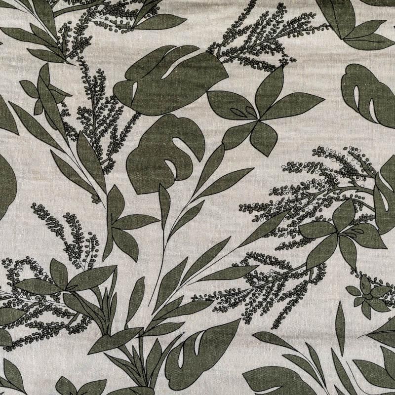 Прочный, выразительная матовая рельефная поверхность, полотняное переплетение, отлично держит форму, жестковатый на ощупь, но комфортный в изделии. Стильный вариант для платьев-футляров, сарафанов, юбок, жакетов, брюк или шорт. Льняная костюмно-плательная ткань с крупным растительным  принтом цвета хаки  на натуральном фоне экрю.