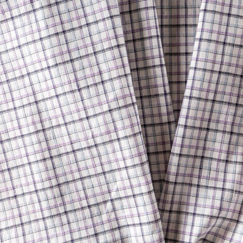 Плательно-рубашечный лен в сложную клетку в фиолетово-голубых оттенках. Ткань легкая, средней плотности, поверхность матовая. Приятная на ощупь, хорошо держит форму, тянется. Отличный вариант для летних  платьев, сарафанов, рубашек, брюк или шорт.