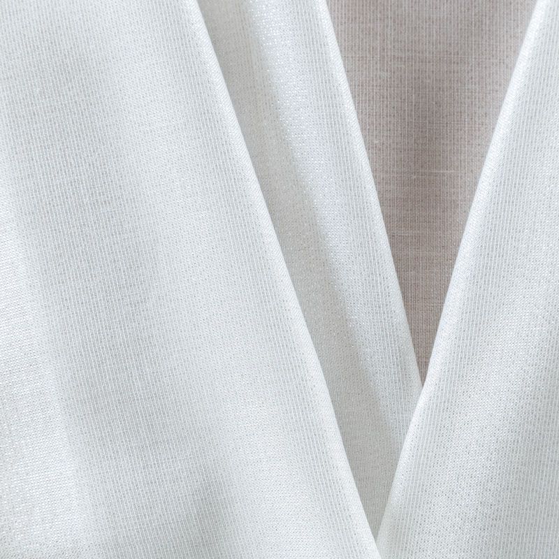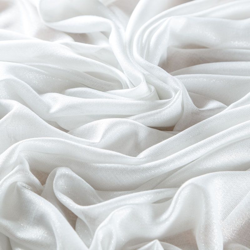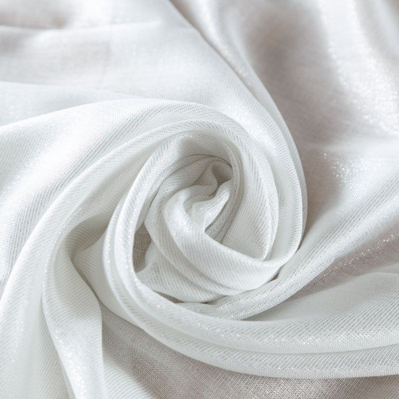 Итальянский нарядный лен с добавлением серебристой люрексовой нити в белом цвете. Ткань тонкая, полупрозрачная, хорошо драпируется, струится, не тянется. Подойдет для пошива блузы, рубашки, топа, туники, платья-рубашки, легких широких брюк, накидки.