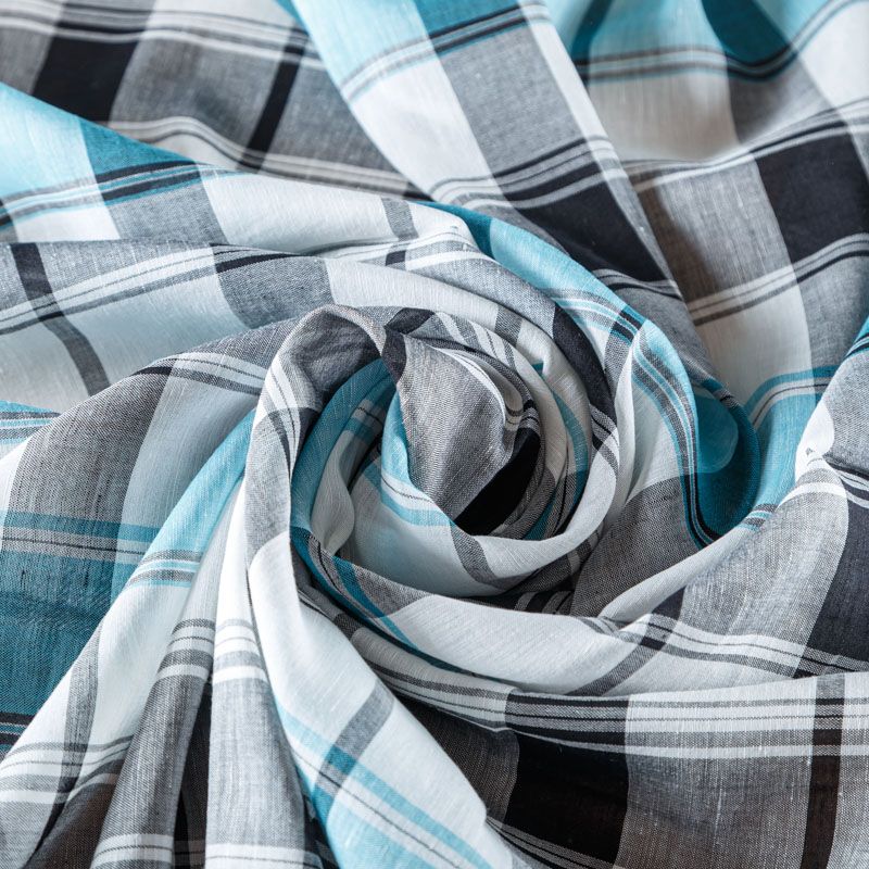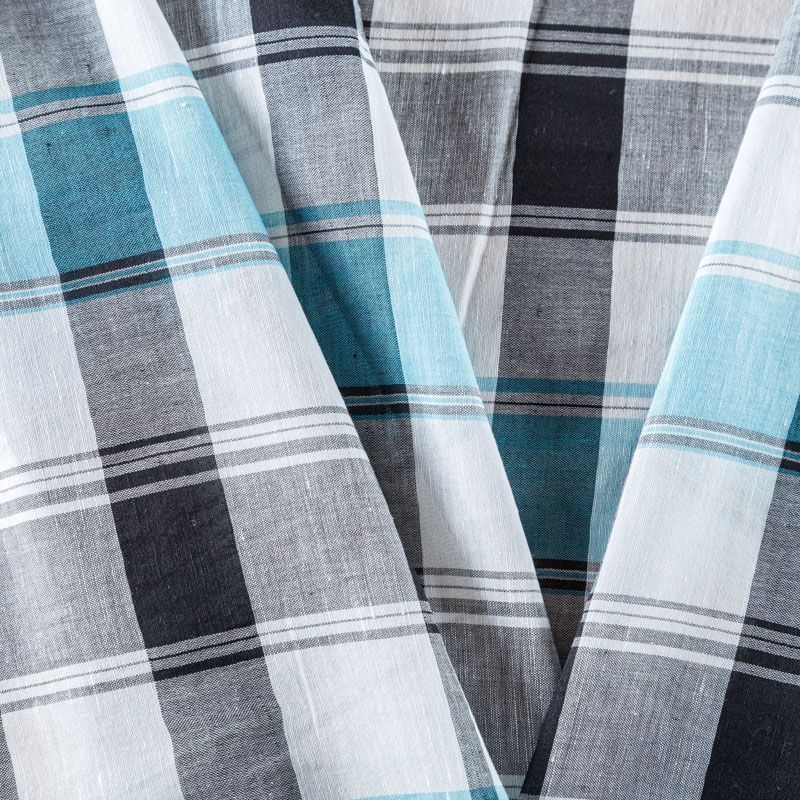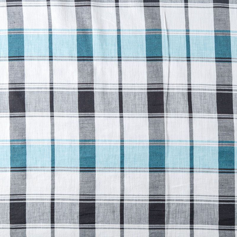 Льняная плательно-рубашечная ткань с добавлением вискозы белого цвета в серо-бирюзовую клетку. Материал прочный, с выразительной матовой рельефной поверхностью, полотняным плетением, хорошо держит форму, мягкий на ощупь, пластичный, отлично драпируется. Прекрасно подойдет для пошива летних платьев, сарафанов, юбок, рубашек, брюк и шорт.
