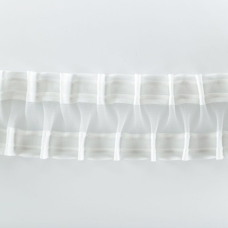 Шторная лента полностью прозрачная для тюлей и портьерных тканей с гофрированными встречными складками. Сокращение - 1:2, раппорт - 6,5 см, ширина ленты - 76 мм, 2 ряда кармашков, 4 стягивающие нити, крепление - крючки.