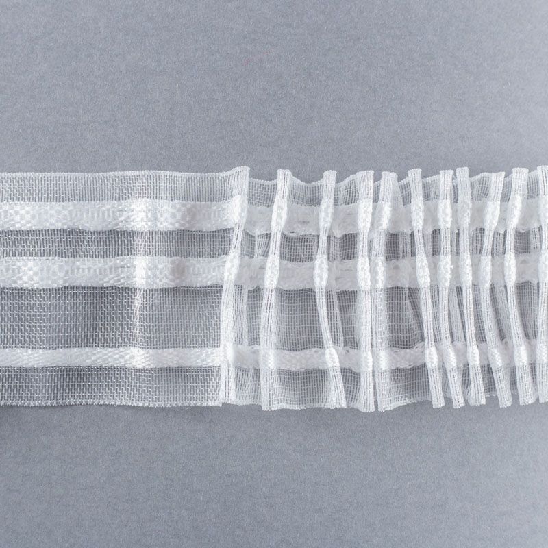 Шторная лента прозрачная для тюлей и портьерных тканей с карандашной сборкой. Сокращение - 1:2, раппорт - 24 см, 2 ряда непрозрачных белых кармашков, крепление - крючки.
