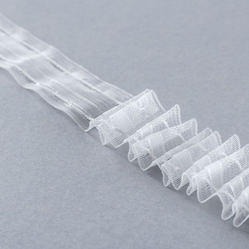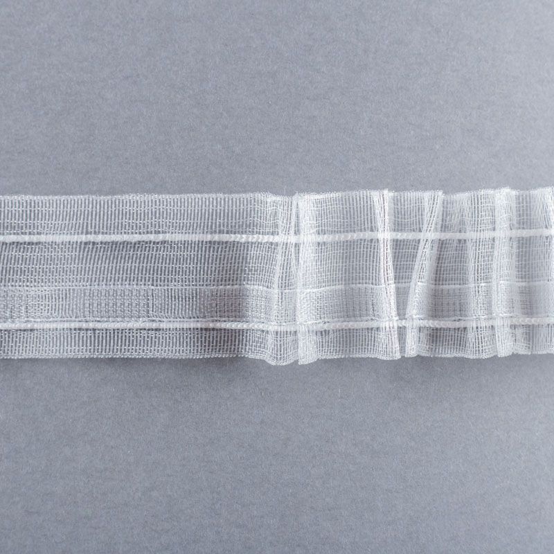 Узкая шторная лента полностью прозрачная для тюлей и портьерных тканей с карандашной сборкой. Сокращение - регулируемое, произвольное, раппорт - 24 см, 1 ряд кармашков, крепление - крючки.