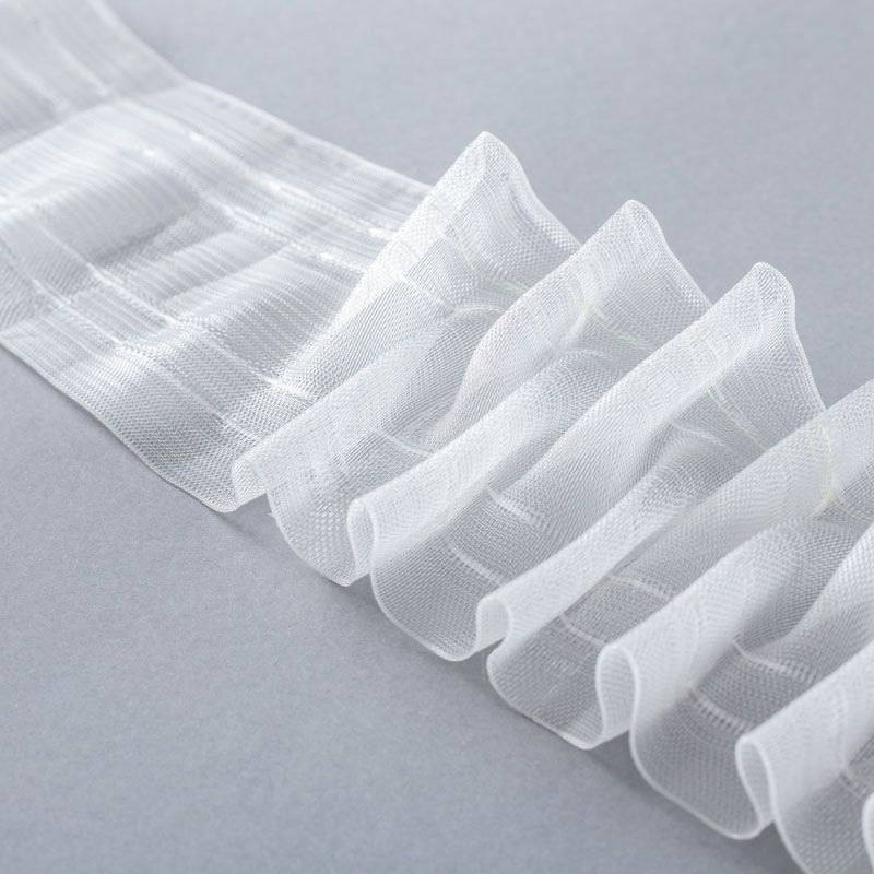 Шторная лента полностью прозрачная для тюлей и легких портьерных тканей с вафельной сборкой. Сокращение - 1:2,5, раппорт - 28 см, 2 ряда кармашков, крепление - крючки.