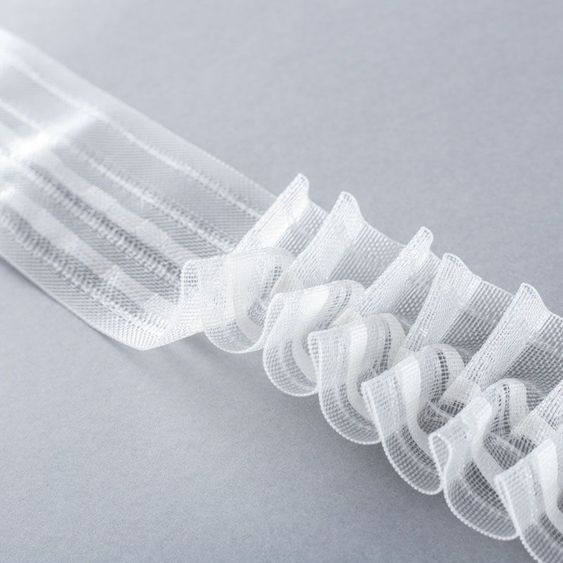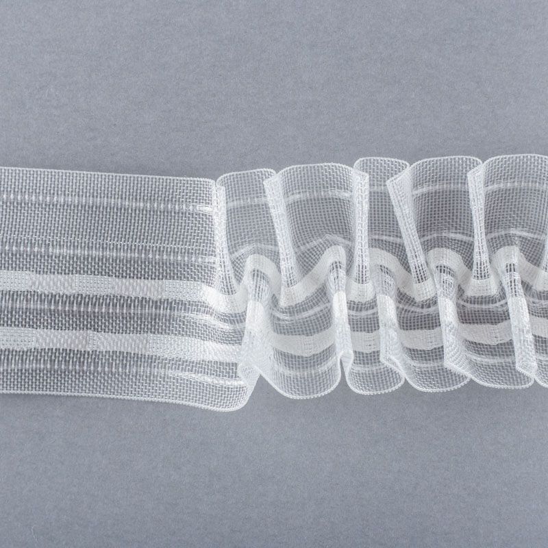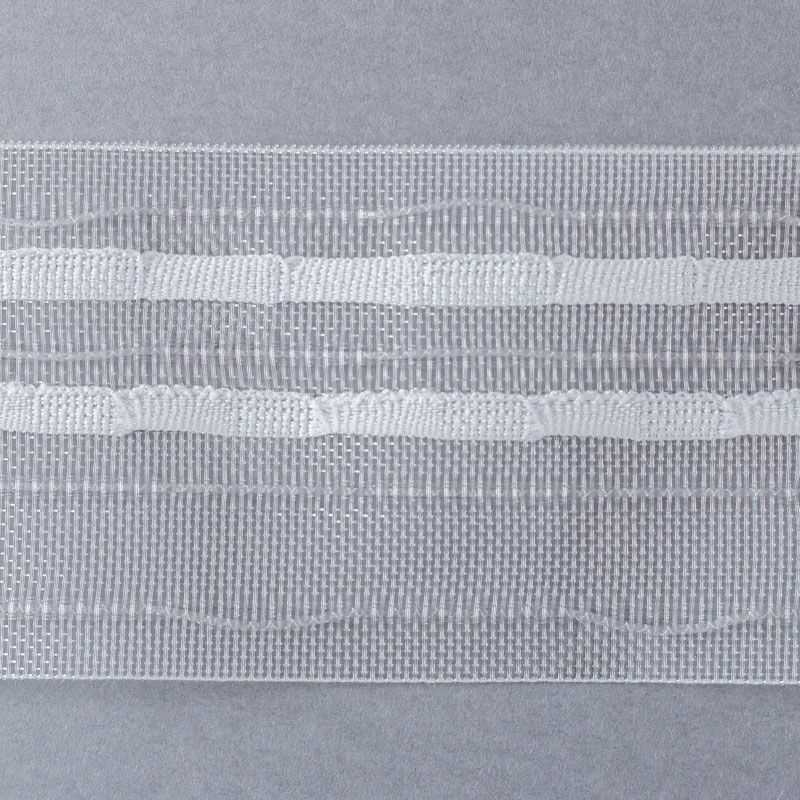 Шторная лента жесткая, прозрачная для тюлей и портьерных тканей c вафельной складкой. Сокращение - регулируемое, произвольное, 2 ряда белых текстильных кармашков, стягивается на 4 нитки, крепление - крючки.