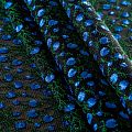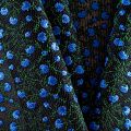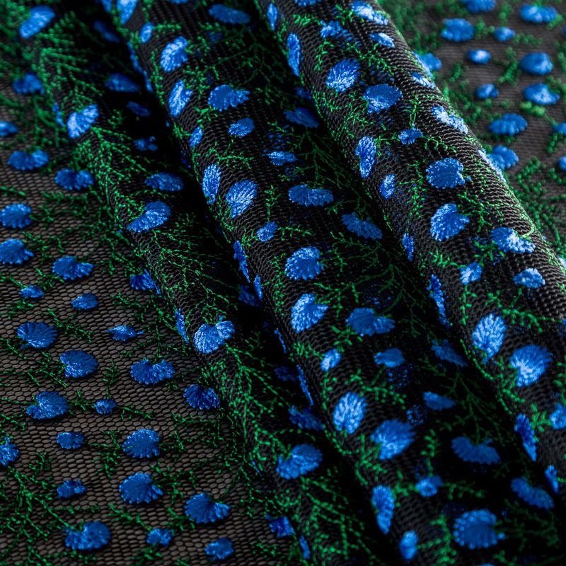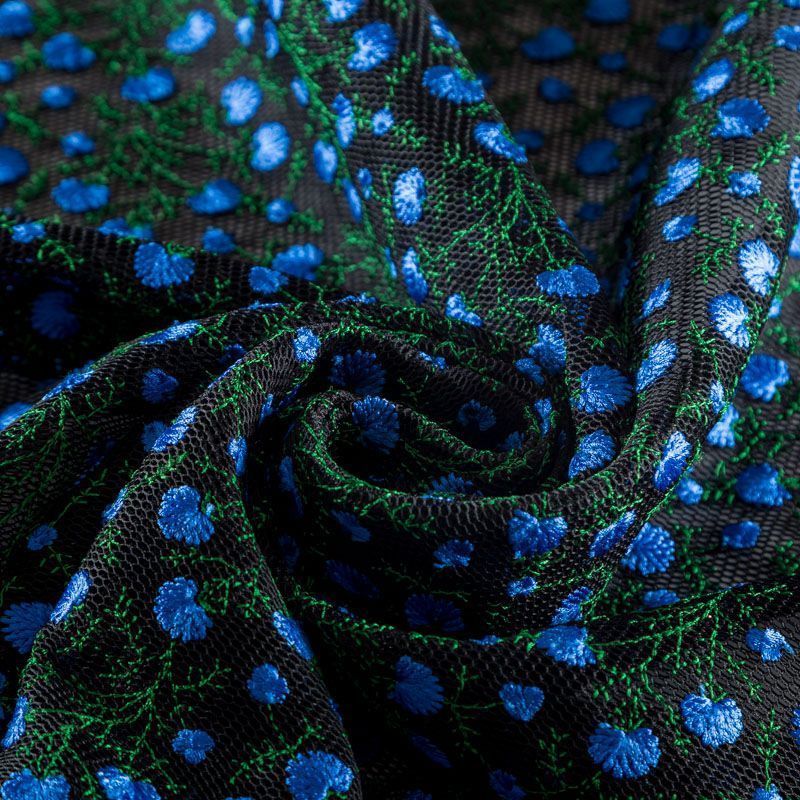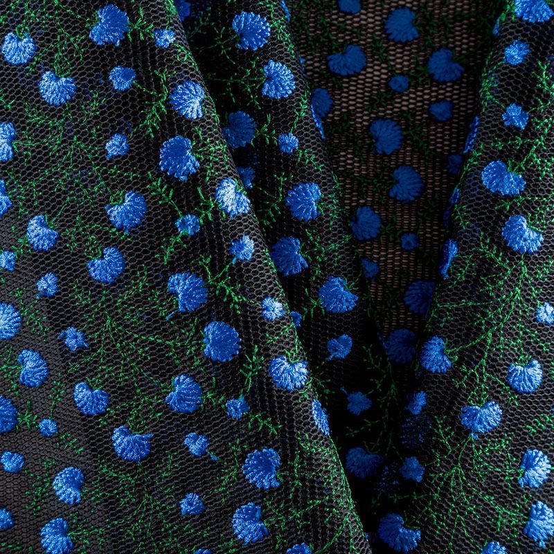 Объемный, эластичный материал черного цвета, состоящий из двойной мелкой сетки, по форме напоминающей соты, украшенный "богатой" цветочной вышивкой. Упругое, мягкое с полупрозрачной фактурой полотно, пластичное и довольно прочное. Хорошо тянется, легкое и комфортное. Отлично держит форму. Рекомендуется для пошива объемных изделий или элементов: эксклюзивного жакета, бомбера, платья, юбки.