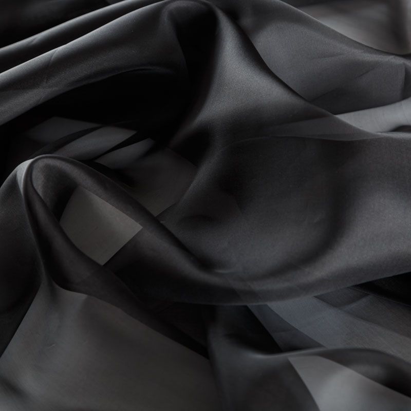 Шелковая невесомая органза с искрящейся поверхностью черного цвета. Ткань легкая, тонкая, пластичная, хорошо драпируется, просвечивает, отлично держит форму. Подойдет на блузку, платье, тунику или юбку на подкладе.