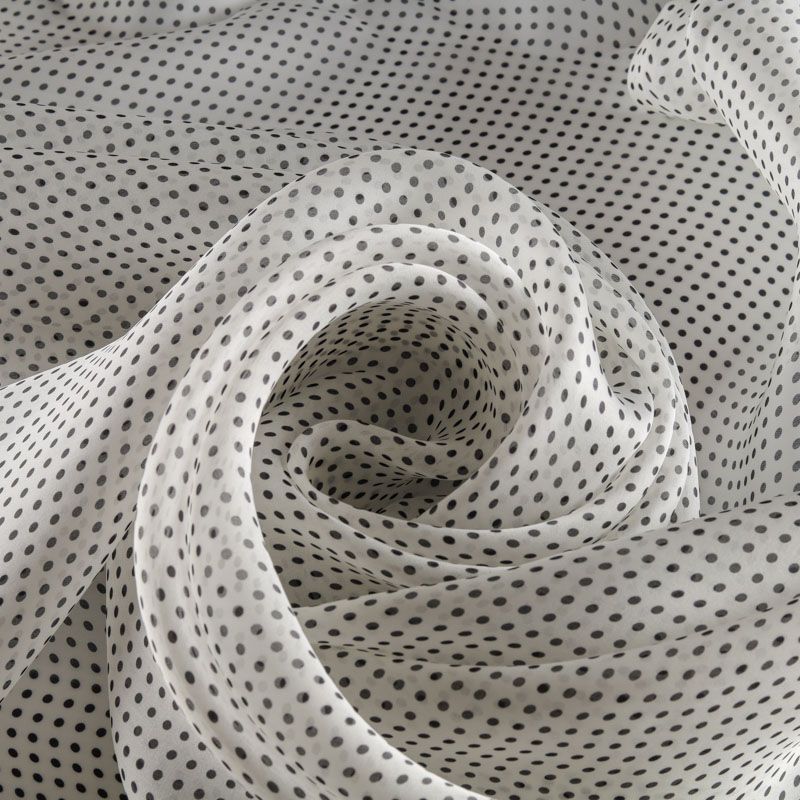 Итальянская шелковая полупрозрачная органза сумрачно-белого цвета с мелким принтом в горошек. Ткань очень легкая, воздушная, отлично держит характерную для органзы форму, но при этом она не жесткая, пластично драпируется объемными фалдами. Идеальна для пошива платья свободного силуэта с нижним чехлом, блузы с объемными рукавами, летней туники, рубашки.