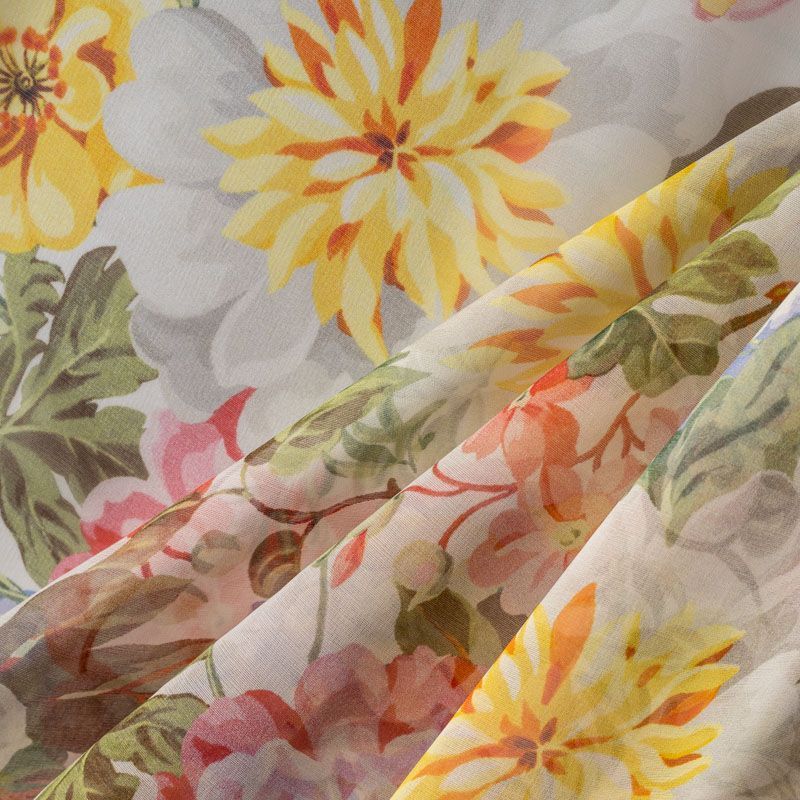 Шелковая воздушная ткань молочного оттенка с акварельным цветочным принтом. Органза достаточно формоустойчива, но пластична, она закладывается объемными фалдами и лучше всего подходит для создания и отделки пышных нарядных юбок, платьев и блуз.