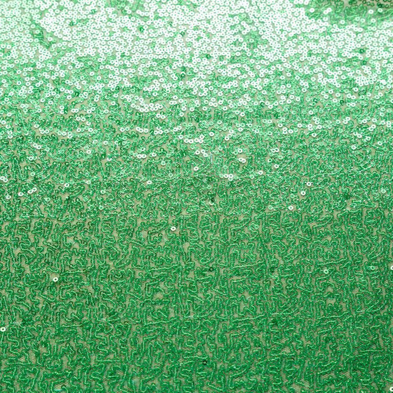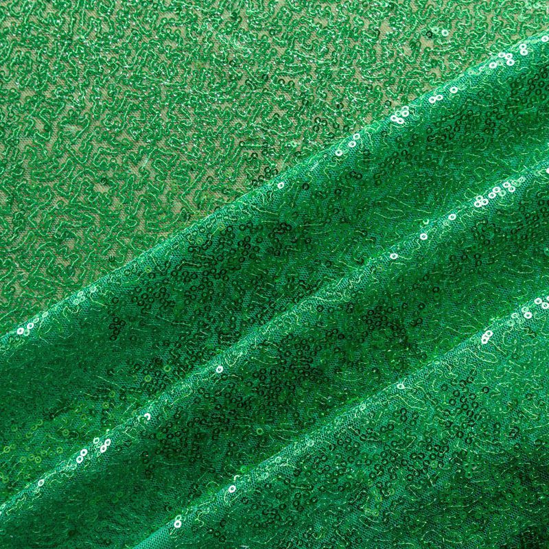 Блестящие пайетки в зеленом оттенке. Мелкие, размером около 3 мм, расположены в хаотичном порядке. Основа - мягкая и эластичная сетка.  Ткань полупрозрачная, может потребоваться подклад. Подойдет для вечернего, коктейльного платья, юбки, нарядных детских изделий, танцевальных и сценических костюмов.