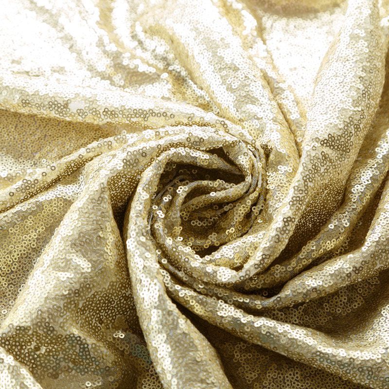 Блестящие пайетки в золотистом оттенке. Мелкие, размером около 3 мм, расположены в хаотичном порядке. Основа - мягкая и эластичная сетка.  Ткань полупрозрачная, может потребоваться подклад. Подойдет для вечернего, коктейльного платья, юбки, нарядных детских изделий, танцевальных и сценических костюмов.