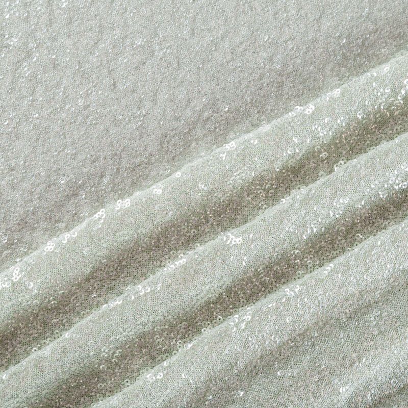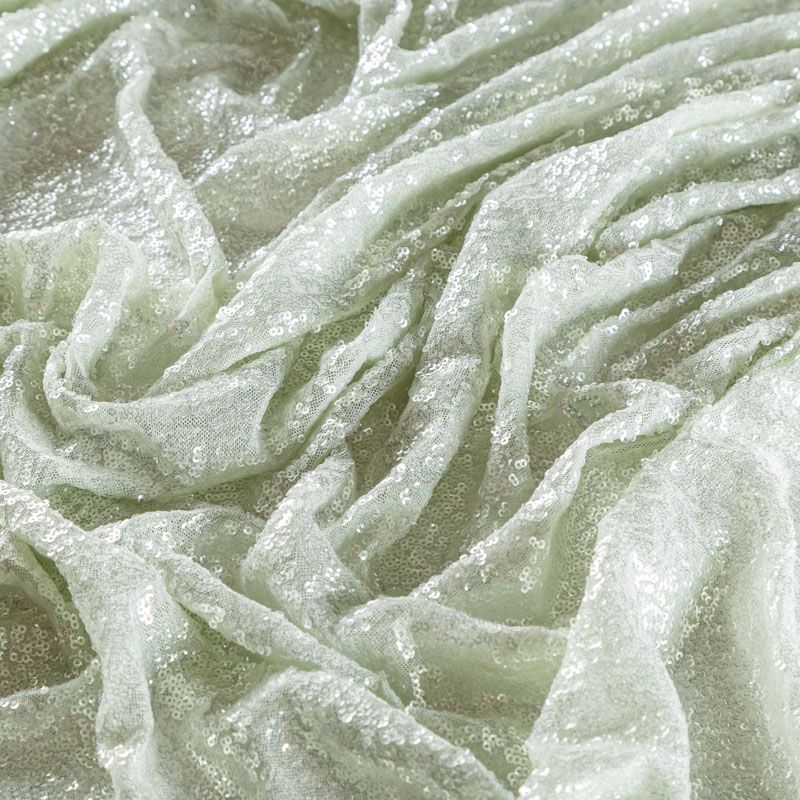 Тонкая эластичная сетка светло-зеленого оттенка по всей поверхности усеяна мелкими прозрачными глянцевыми пайетками. Ткань очень хорошо драпируется, красиво переливается, имеет глянцевый блеск, пластичная и эластичная и в длину, и в ширину. Пайетки — идеальный материал для праздников и вечеринок. Из них получится эффектное платье, жакет, боди, топ, туника, юбка или комбинезон.