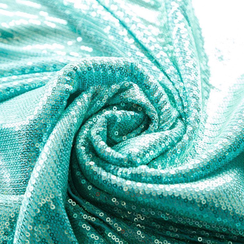 Блестящие пайетки в бирюзовом оттенке. Мелкие, размером около 3 мм, расположены в хаотичном порядке. Основа - мягкая и эластичная сетка.  Ткань полупрозрачная, может потребоваться подклад. Подойдет для вечернего, коктейльного платья, юбки, нарядных детских изделий, танцевальных и сценических костюмов.