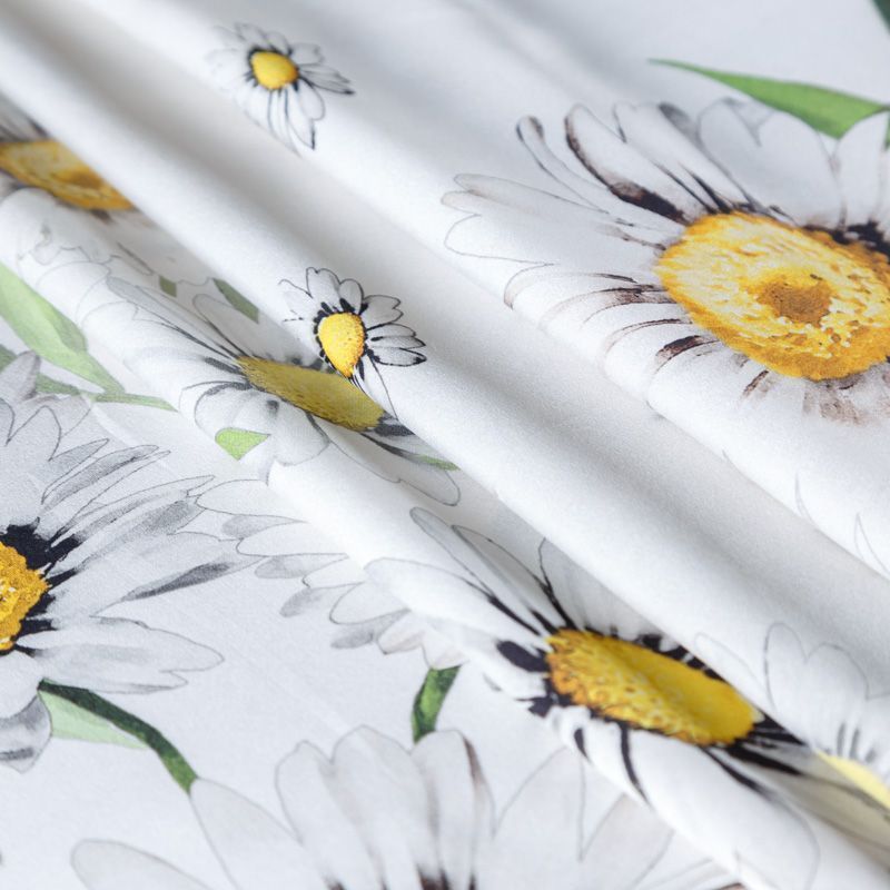 Эффектный и стильный платок с крупными ромашками на белом фоне с черным кантом. Платок выполнен из натурального итальянского шелка атласного плетения. Такой аксессуар добавит свежести и весеннего настроения в Ваш образ.