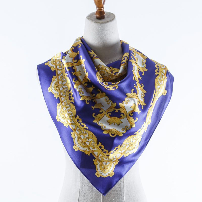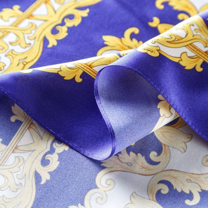 Платок выполнен из натурального итальянского атласного шелка с вензельным орнаментом на фиолетово-синем насыщенном фоне. Невесомый, воздушный, мягкий и пластичный, летящий, поверхность с красивым матовым блеском. Будет отличным стильным аксессуаром к платью, костюму, жакету или пальто.