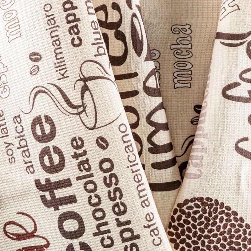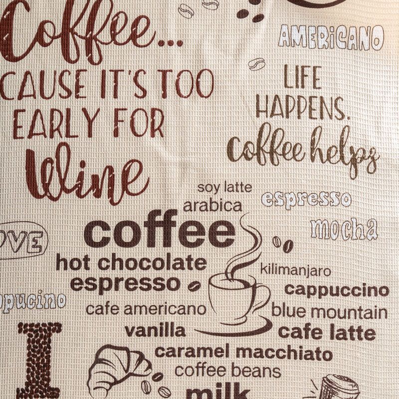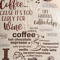 Качественная натуральная хлопчатобумажная ткань, обладающая высокой гигроскопичностью, с принтом на кофейную тему. Универсальный материал, из которого  шьют кухонные полотенца, скатерти, прихватки, салфетки.